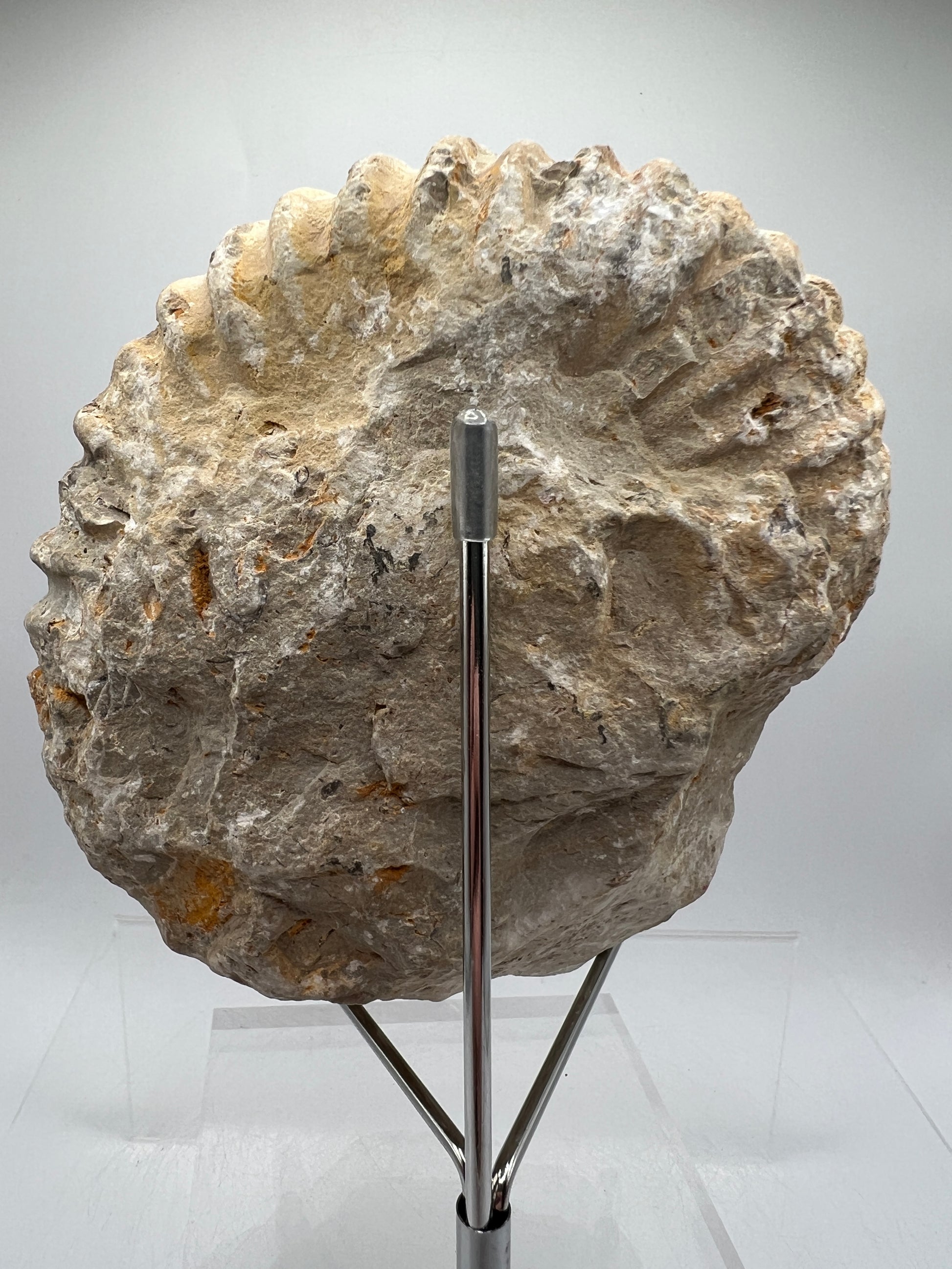 Discover the beauty of an Ammonite Shell Fossil, a rare and all-natural specimen from the cephalopod family that lived between 240 and 65 million years ago. This unique display piece is a true representation of Earth's history, perfect for any fossil enthusiast or educational setting. Very nice specimen display stand is included.