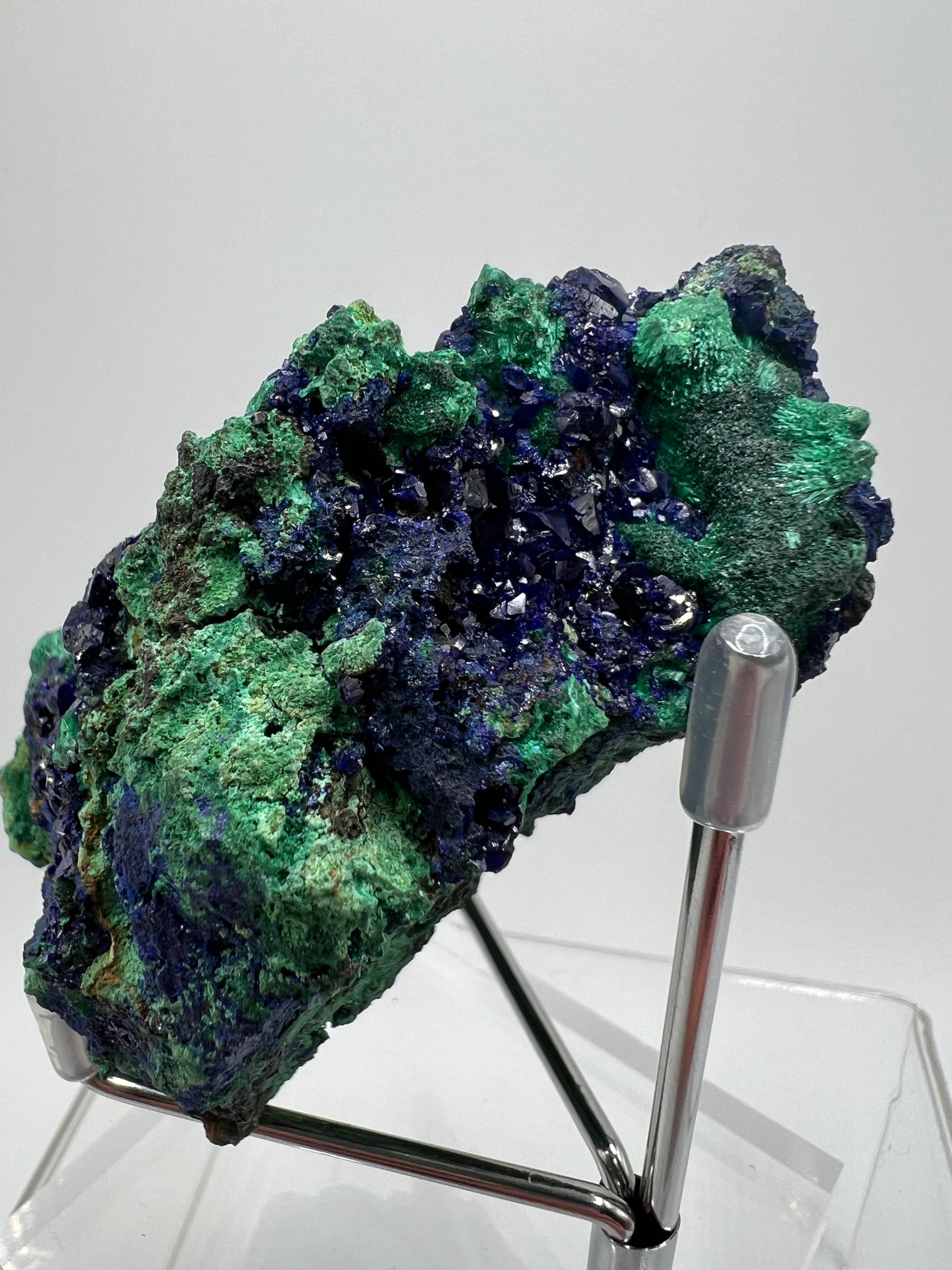 Transform your collection with this stunning Azurite and Malachite Specimen. This rare cluster features high quality Azurite crystals and beautiful Malachite formations. The striking colors will add a unique touch to any display. Don't miss out on this beautiful multi mineral cluster! Very nice specimen display stand is included.