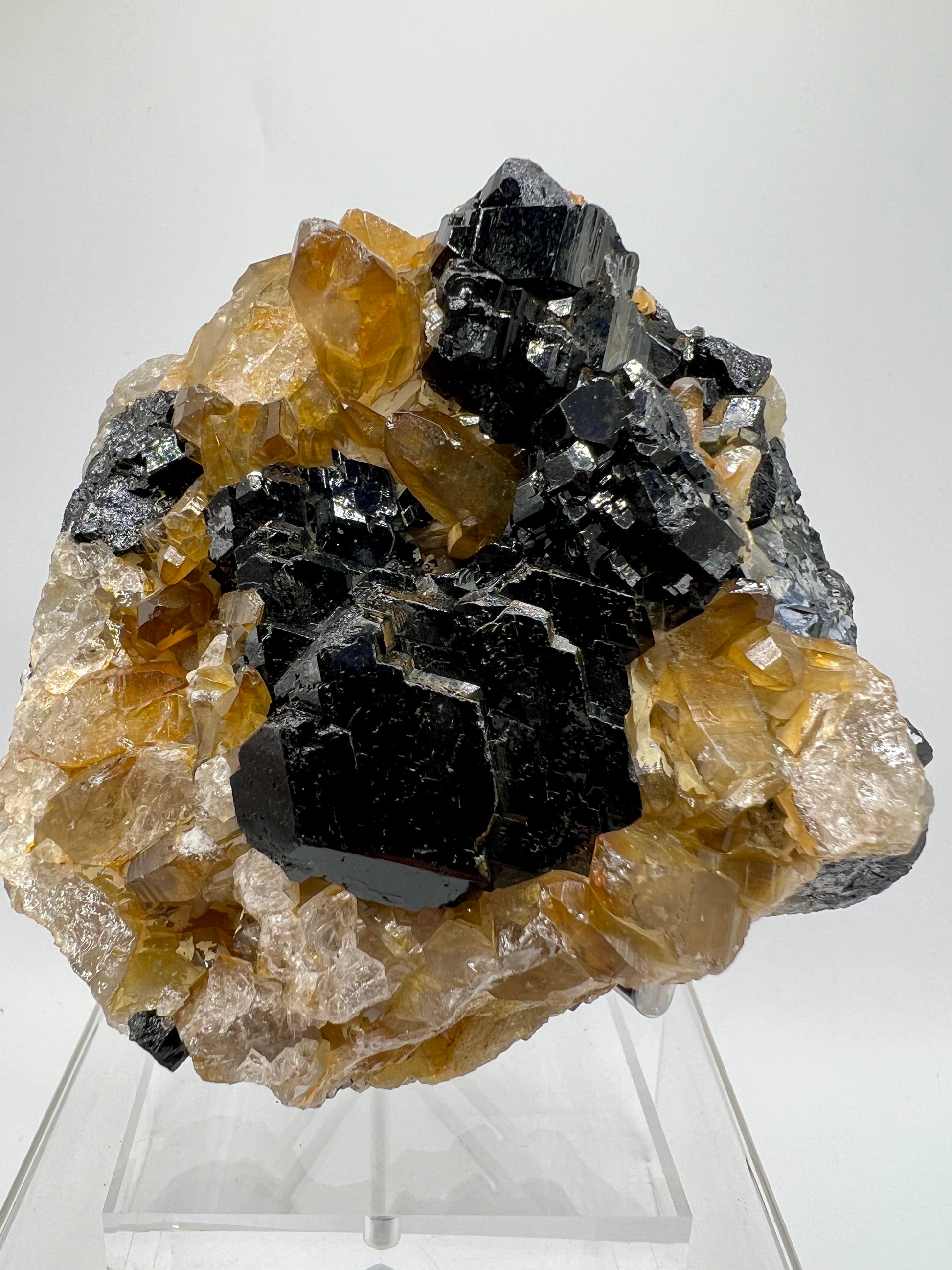 This rare African specimen features a stunning combination of black tourmaline and citrine clusters, originating from Erongo Namibia. With touches of UV reactive Hyalite opal, this crystal formation is truly one of a kind. Add this amazing piece to your collection and experience the unique benefits of these crystals. Very nice specimen display stand is included.