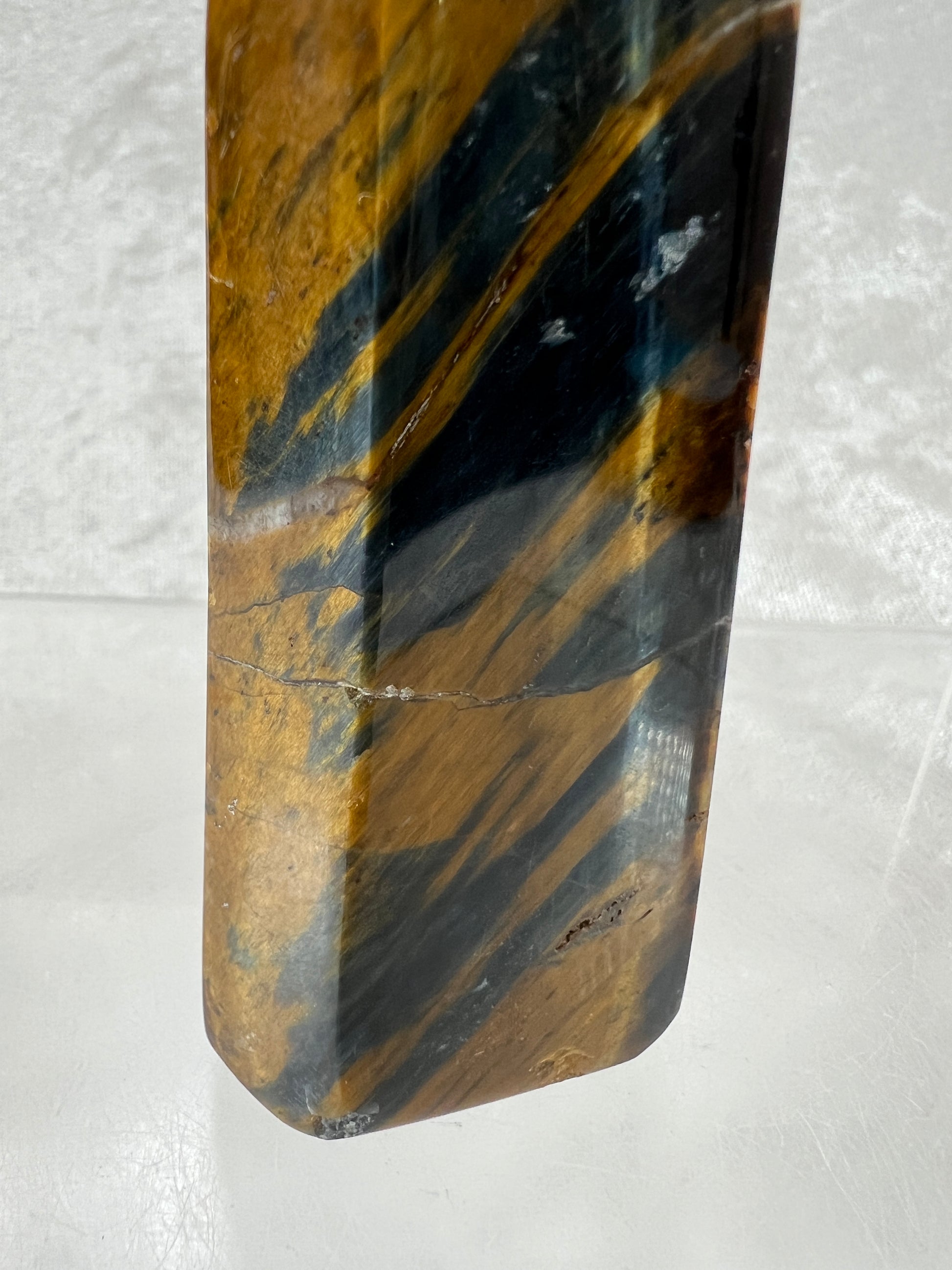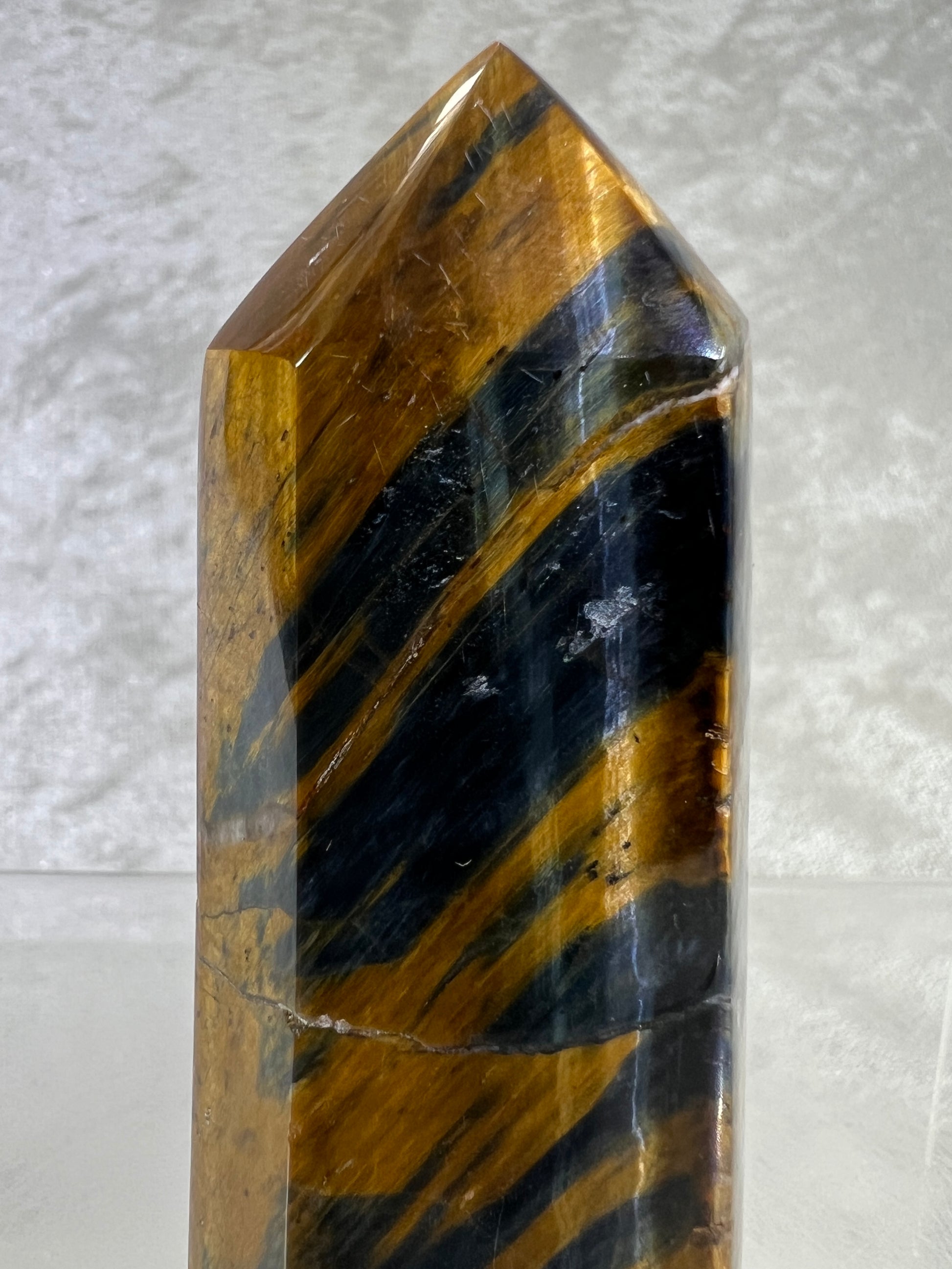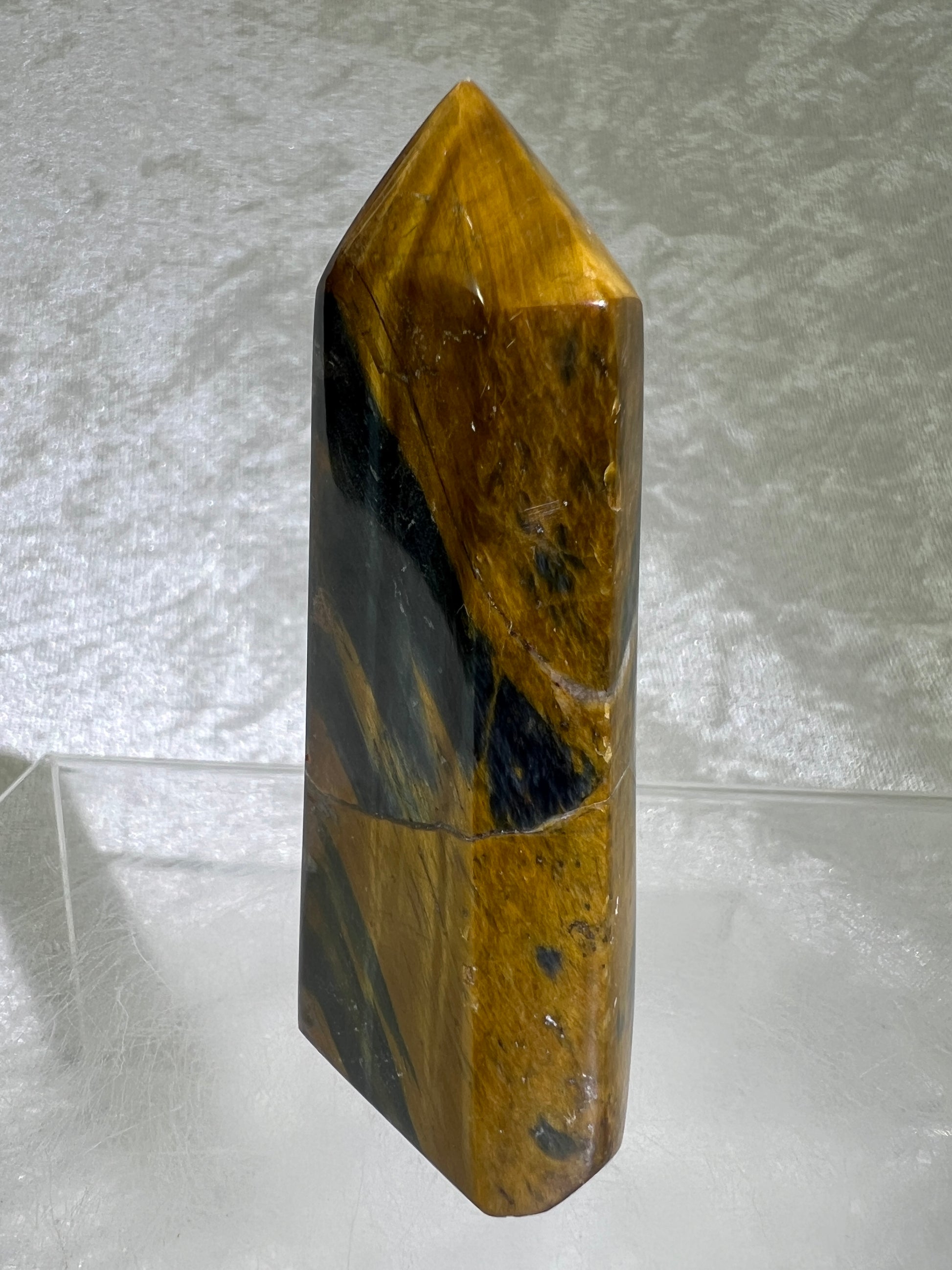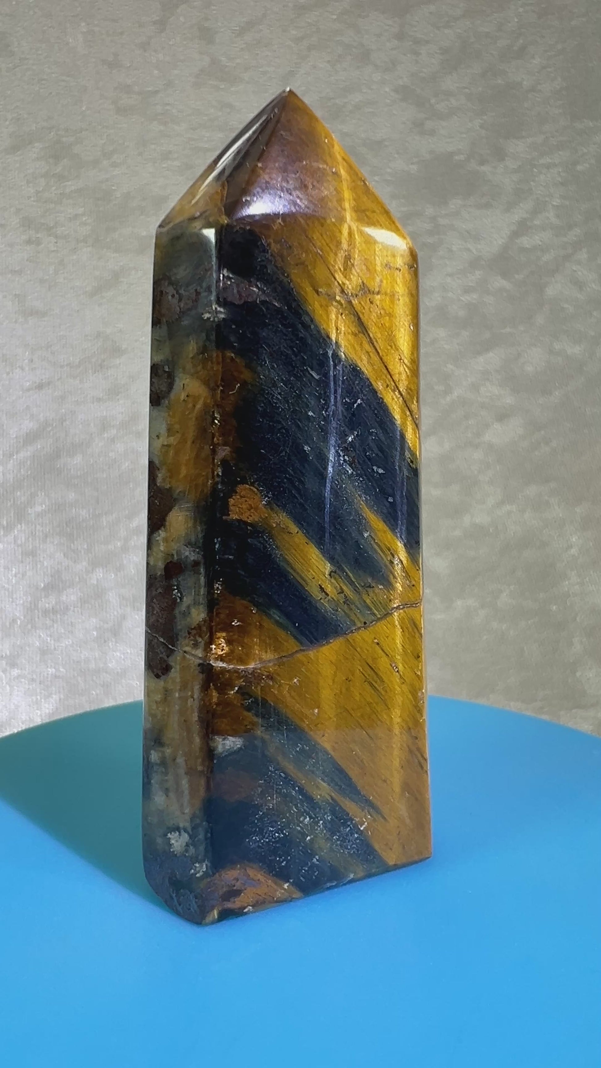Unleash your inner strength with this Blue Tiger’s Eye Crystal Tower, also known as Hawk’s Eye. Its rich blue and golden chatoyance shimmer beautifully under the light, symbolizing protection, focus, and confidence. This rare gemstone tower makes a striking centerpiece for any crystal collection or energy healing space. (Roar sold separately!)