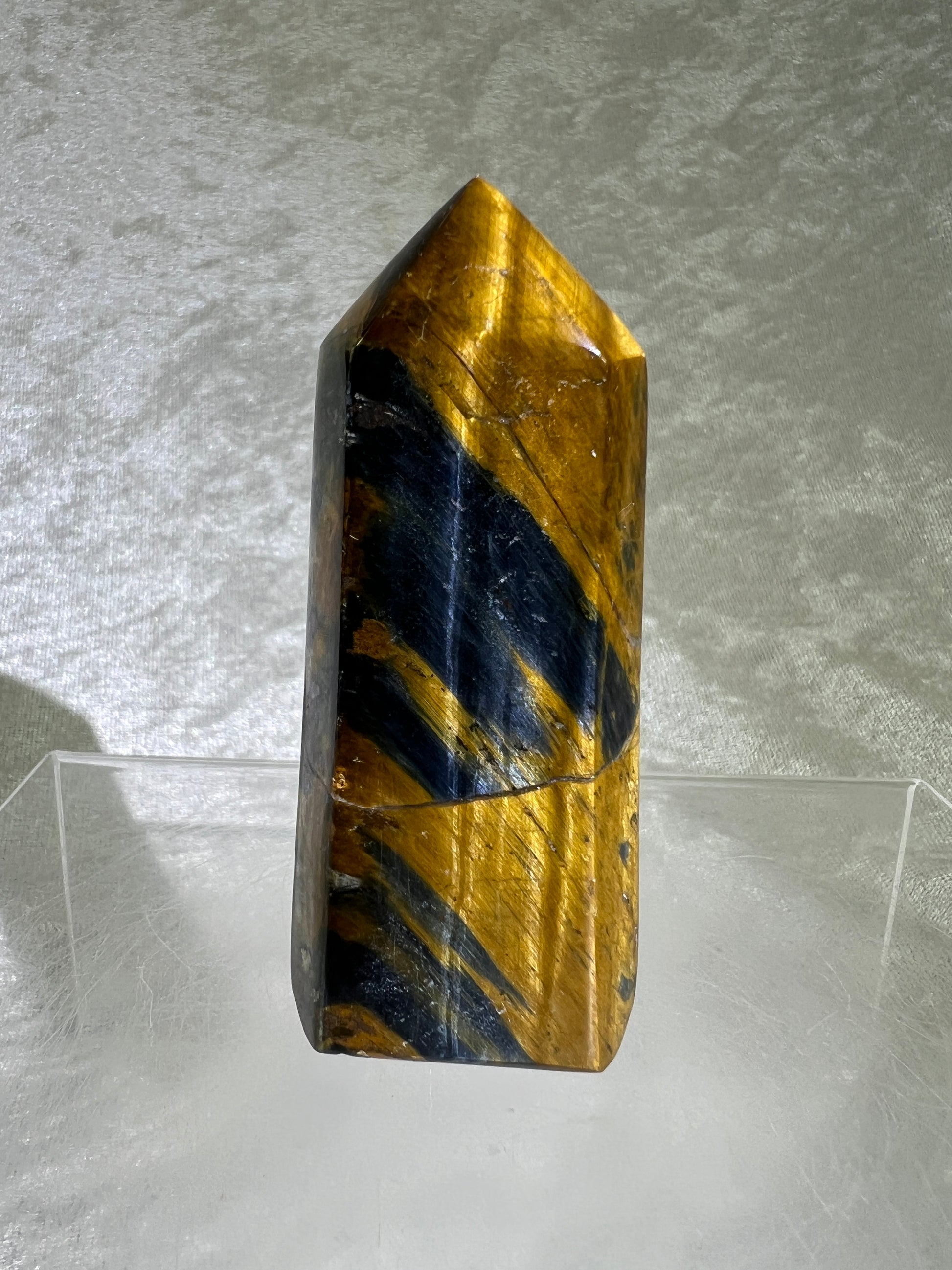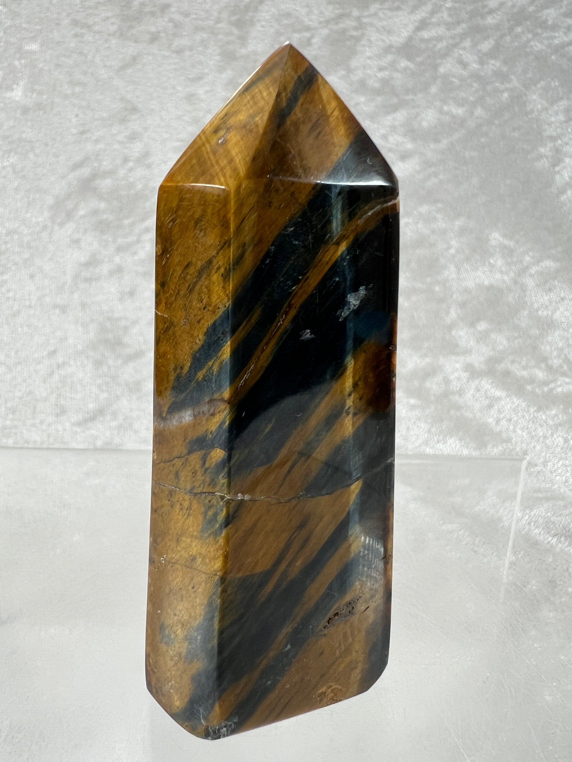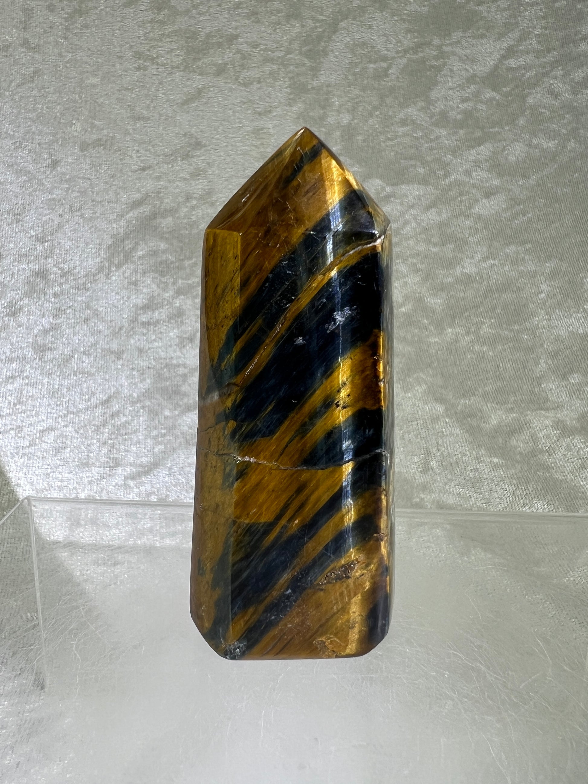 Unleash your inner strength with this Blue Tiger’s Eye Crystal Tower, also known as Hawk’s Eye. Its rich blue and golden chatoyance shimmer beautifully under the light, symbolizing protection, focus, and confidence. This rare gemstone tower makes a striking centerpiece for any crystal collection or energy healing space. (Roar sold separately!)