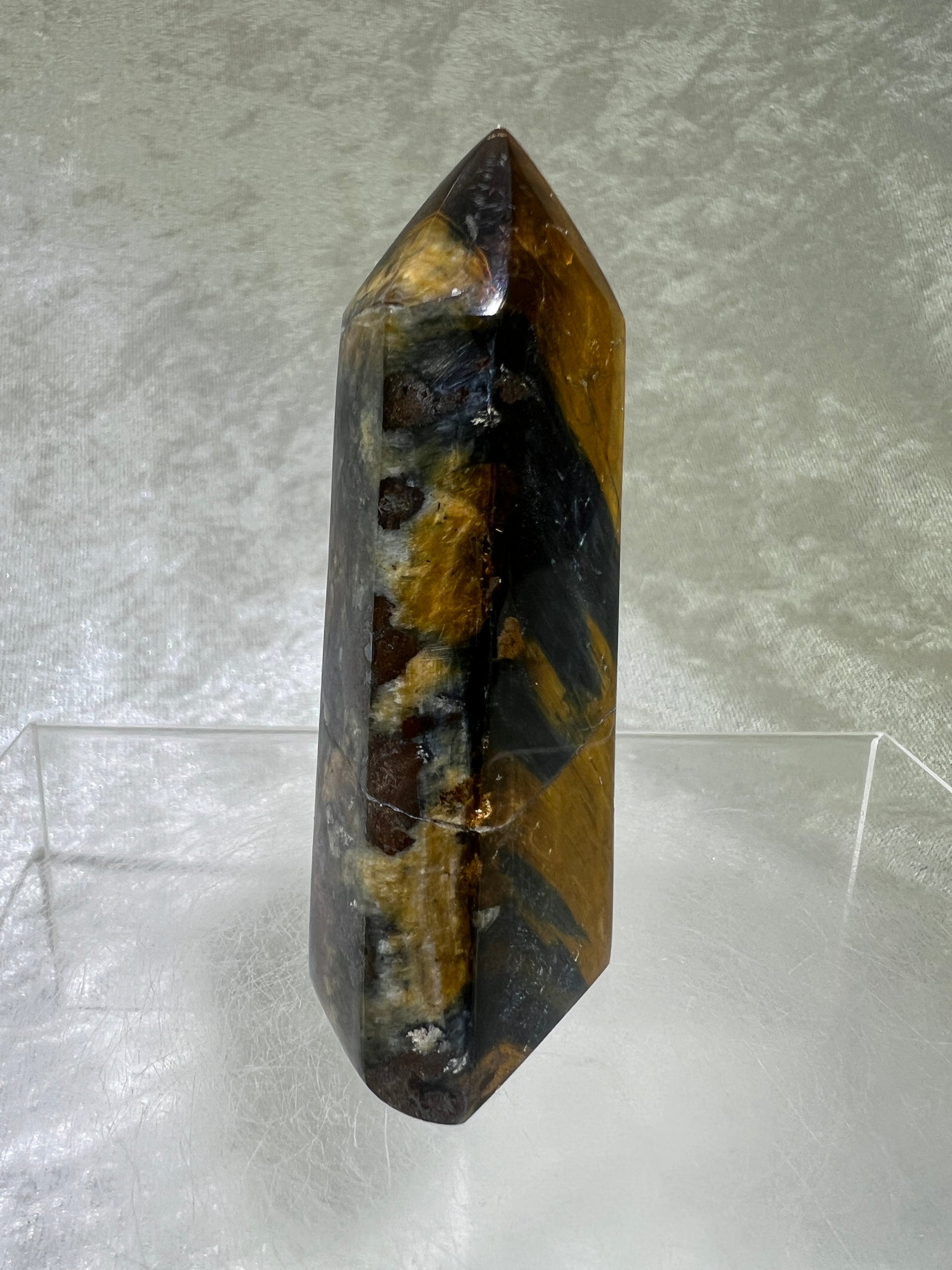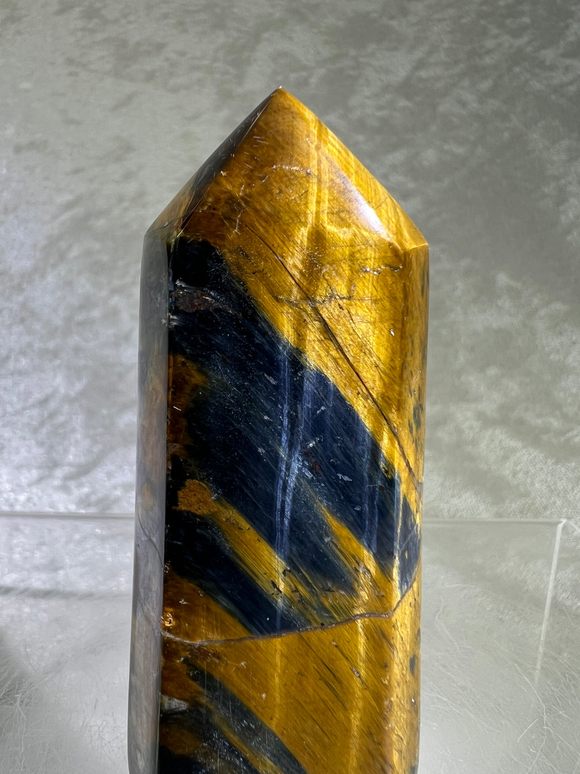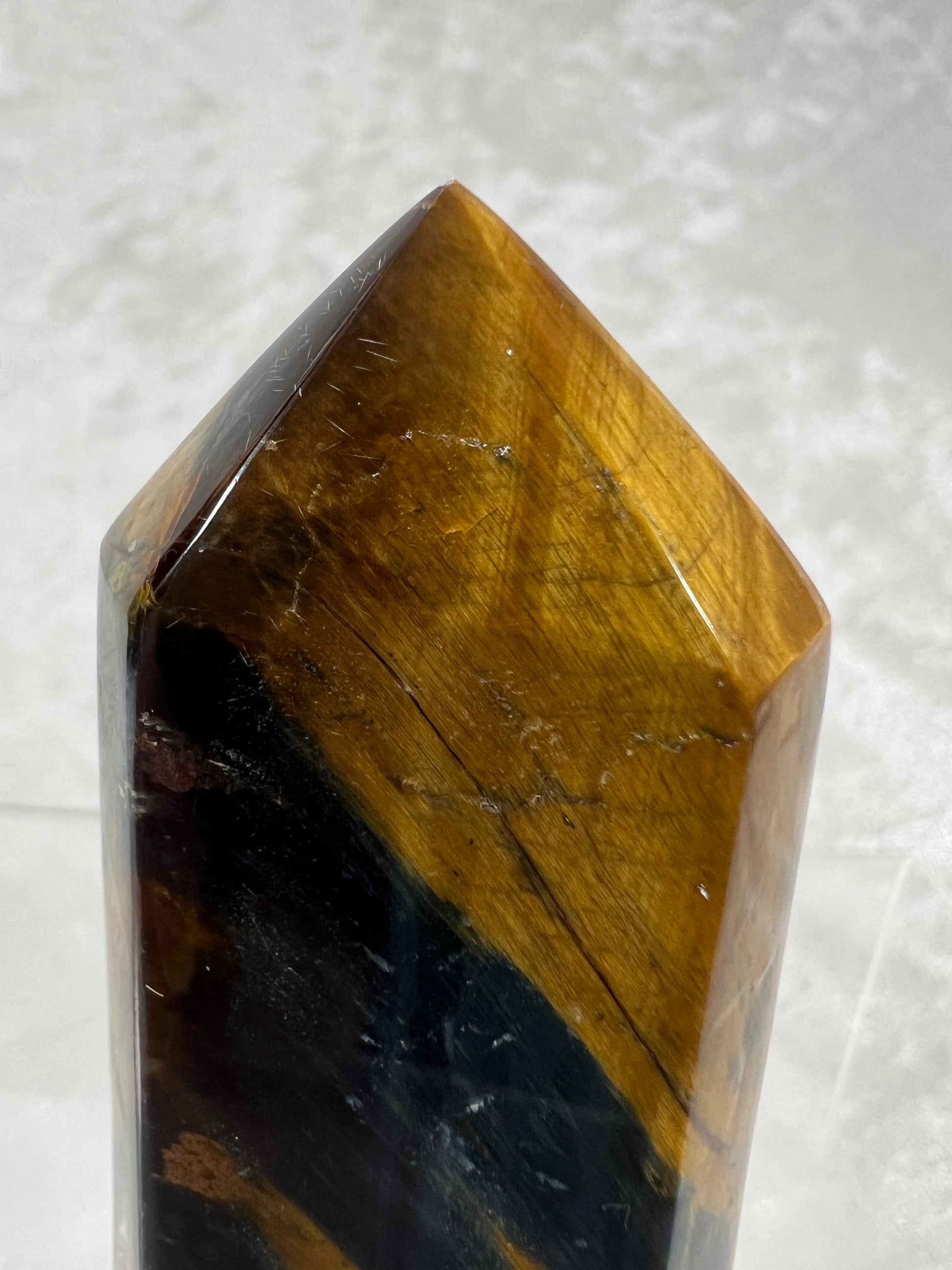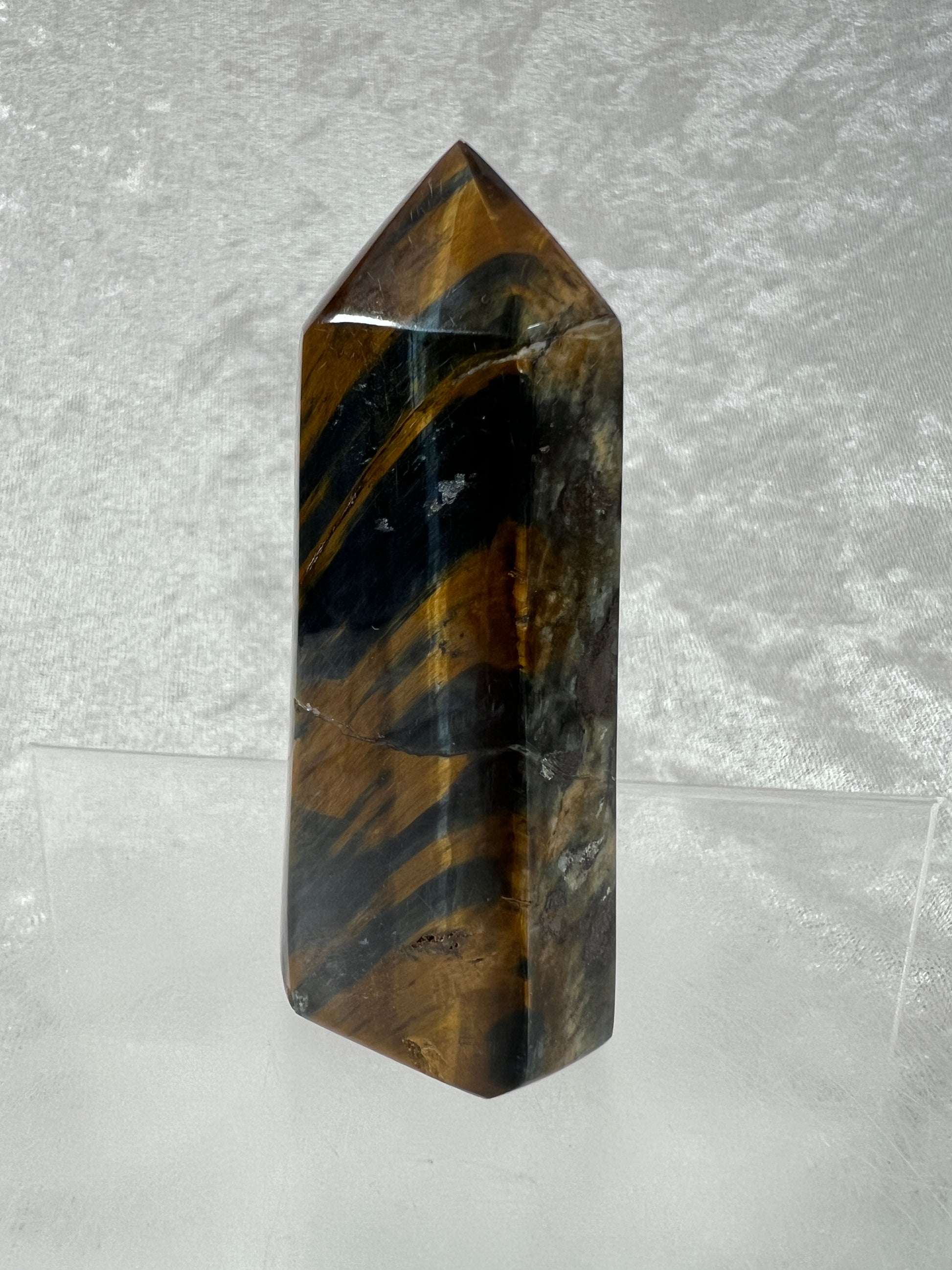 Unleash your inner strength with this Blue Tiger’s Eye Crystal Tower, also known as Hawk’s Eye. Its rich blue and golden chatoyance shimmer beautifully under the light, symbolizing protection, focus, and confidence. This rare gemstone tower makes a striking centerpiece for any crystal collection or energy healing space. (Roar sold separately!)