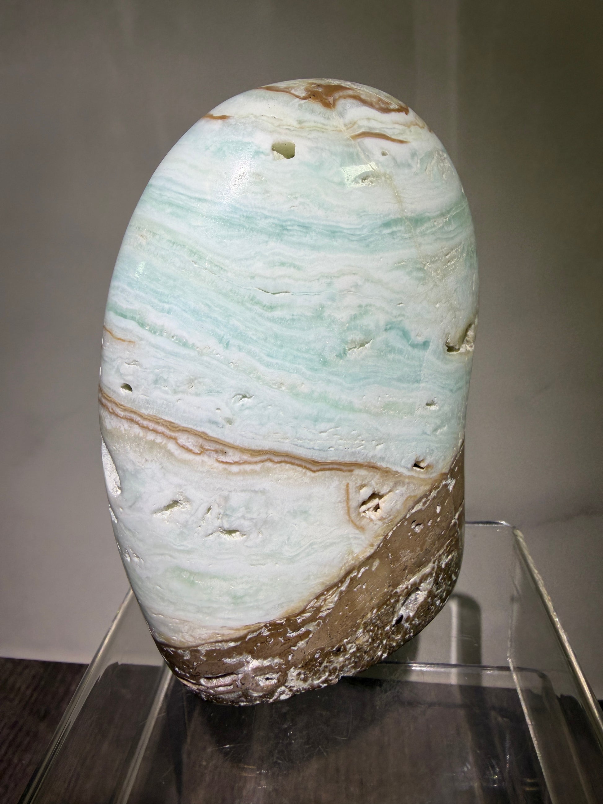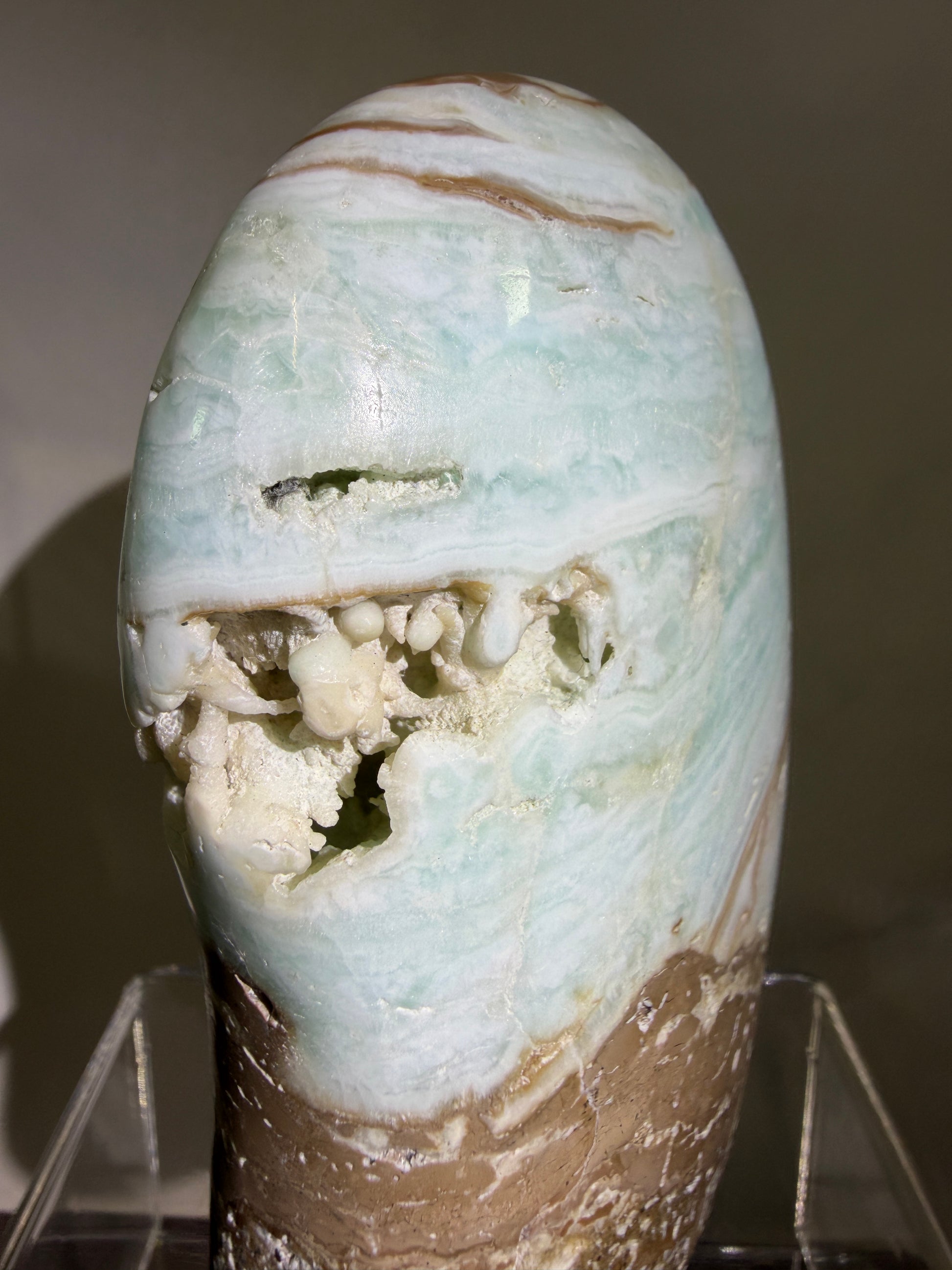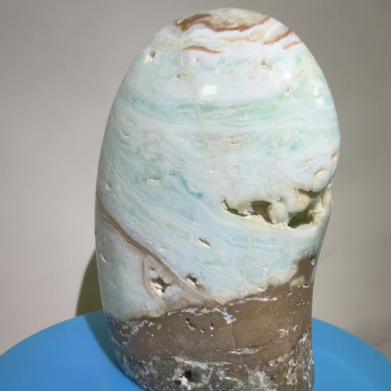 Despite the name Caribbean, this material is a somewhat recent discovery in 2019 from Pakistan. Its gorgeous colors look exactly like a Caribbean beach. Beautiful combination of Blue Calcite, White Aragonite, and Brown Aragonite. Rare carribean calcite freeform. Amazing druzy and awesome banding.