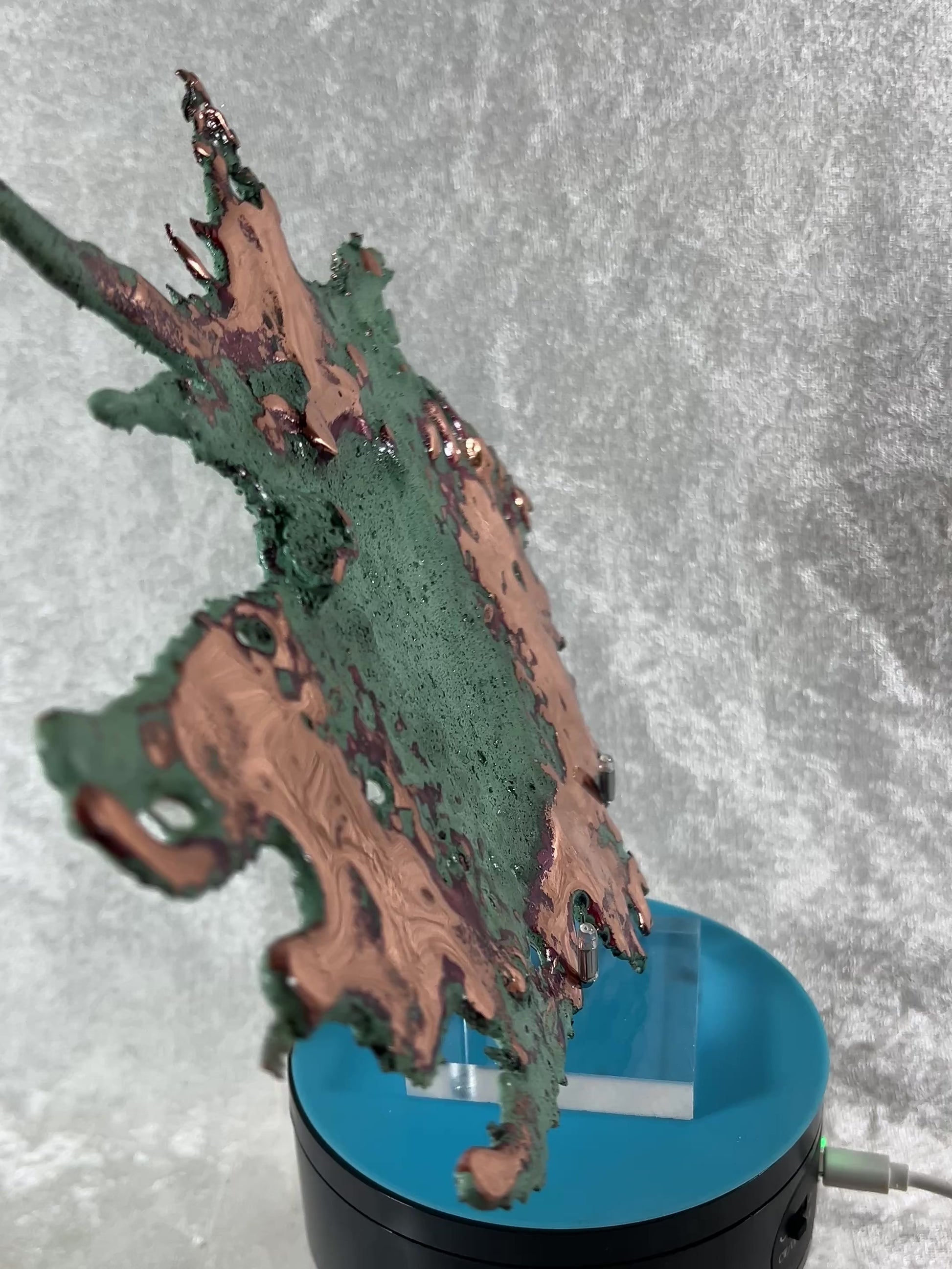 Oxidized splash copper. Native copper from Michigan is used to make these artistic freeform sculptures. Splash copper is made by pouring molten copper at 2300 degrees onto a flat surface. When the shape is cooled a green chemical patina is applied, then highlights are polished to expose the glowing copper underneath. The sculptures are then sealed to preserve the finish and prevent tarnishing. Amazing One Of A Kind copper display piece. A very nice specimen display stand is included.