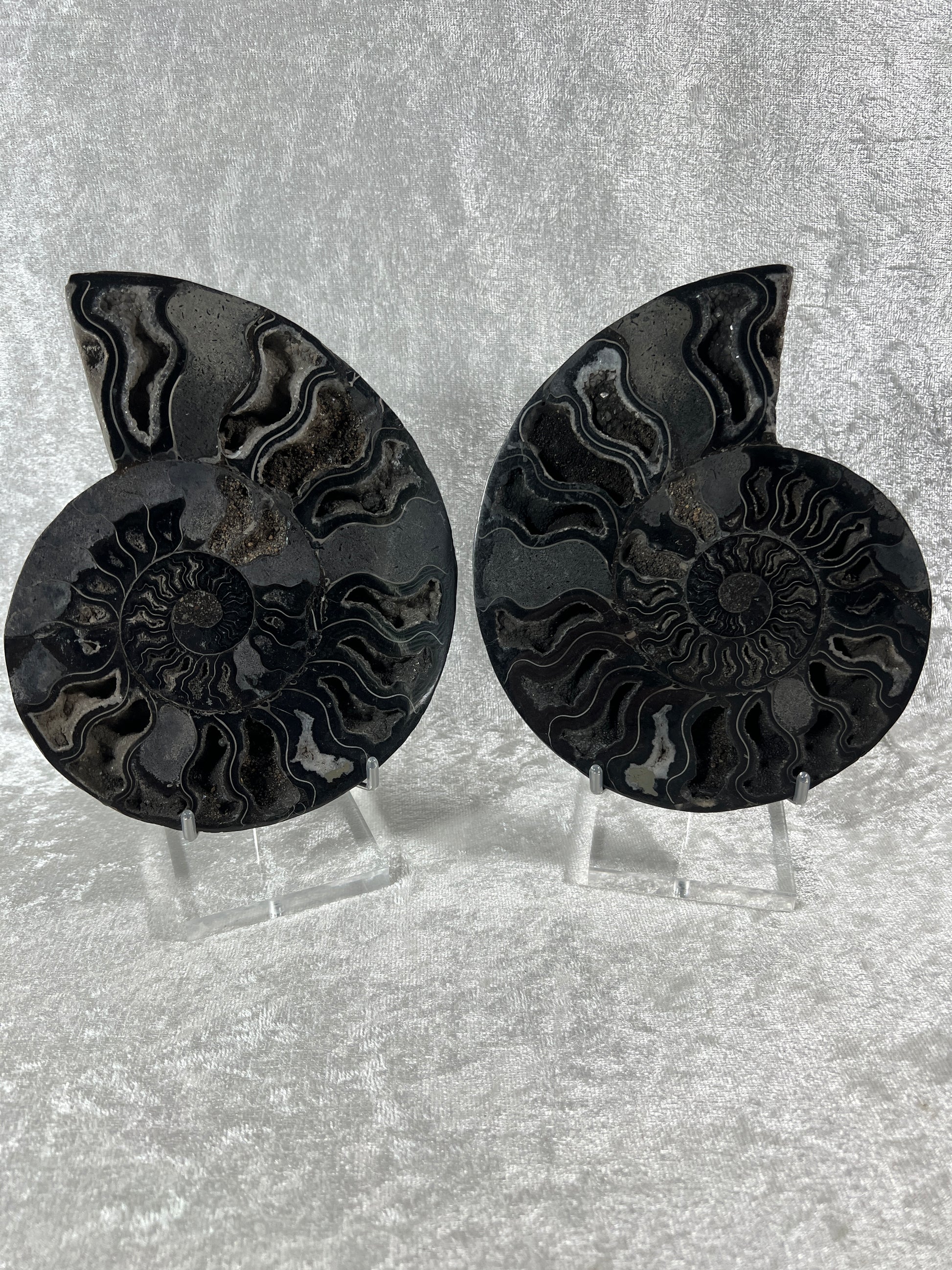 Black Ammonite Display Pair. Extra Large Rare Fossil Specimen From Madagascar. Split And Polished With Amazing Druzy.