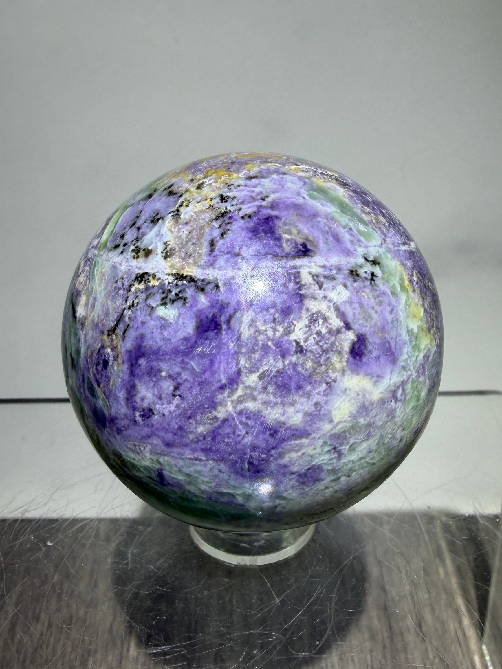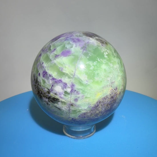 Introducing the Bolivianite Crystal Sphere, a beautiful combination of fluorite and serpentine from Bolivia. This rare new material is not only visually stunning but also offers potential benefits such as calming and grounding properties. Own a piece of nature's finest with this pretty display sphere.