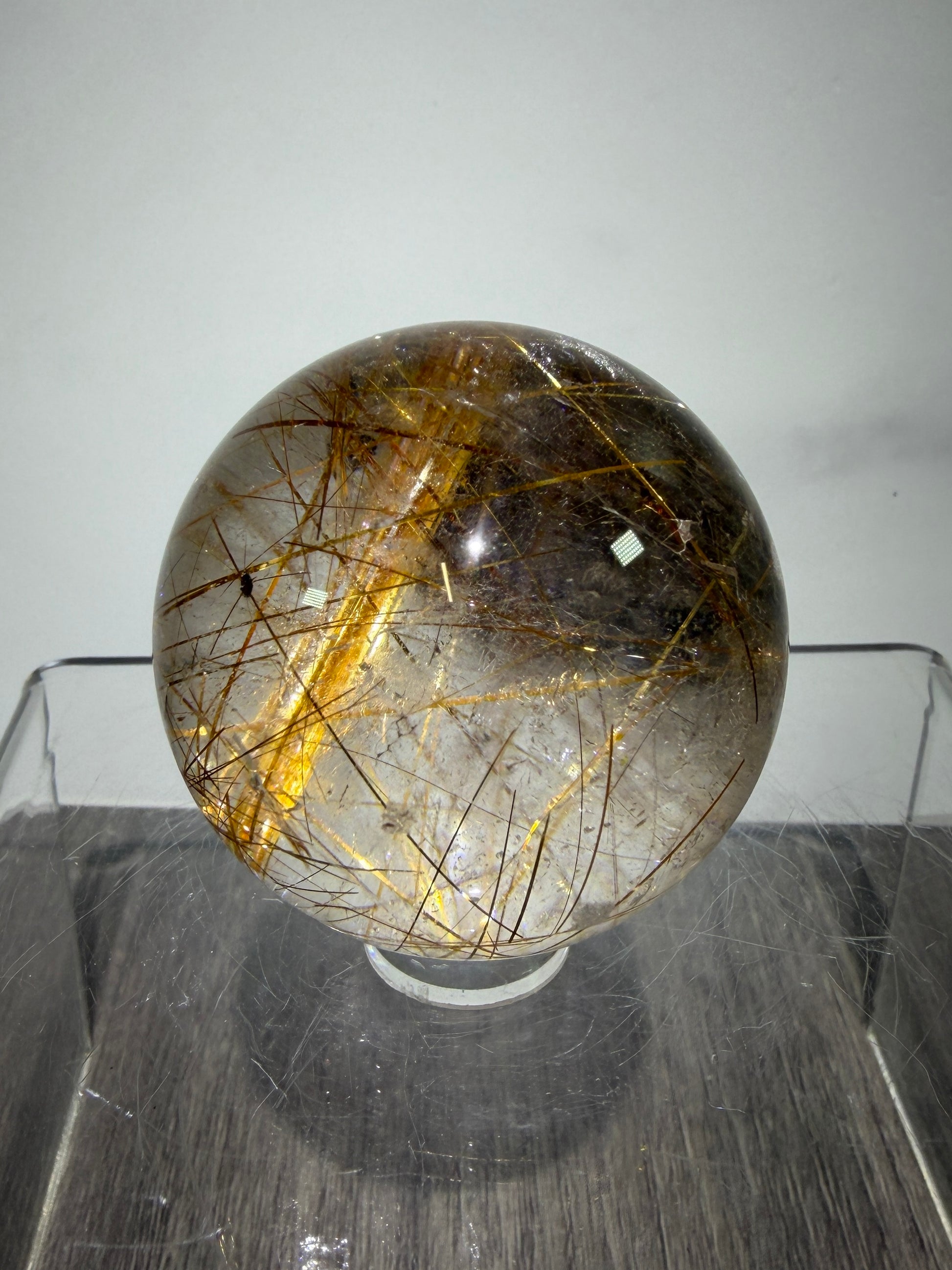 Discover the mesmerizing beauty of our Copper Rutile Quartz Sphere. This small delight features rutile inclusions, and a stunning rare hematite slab. Its rare color and high quality make it a must-have for any crystal enthusiast. Elevate your collection with this exceptional piece.