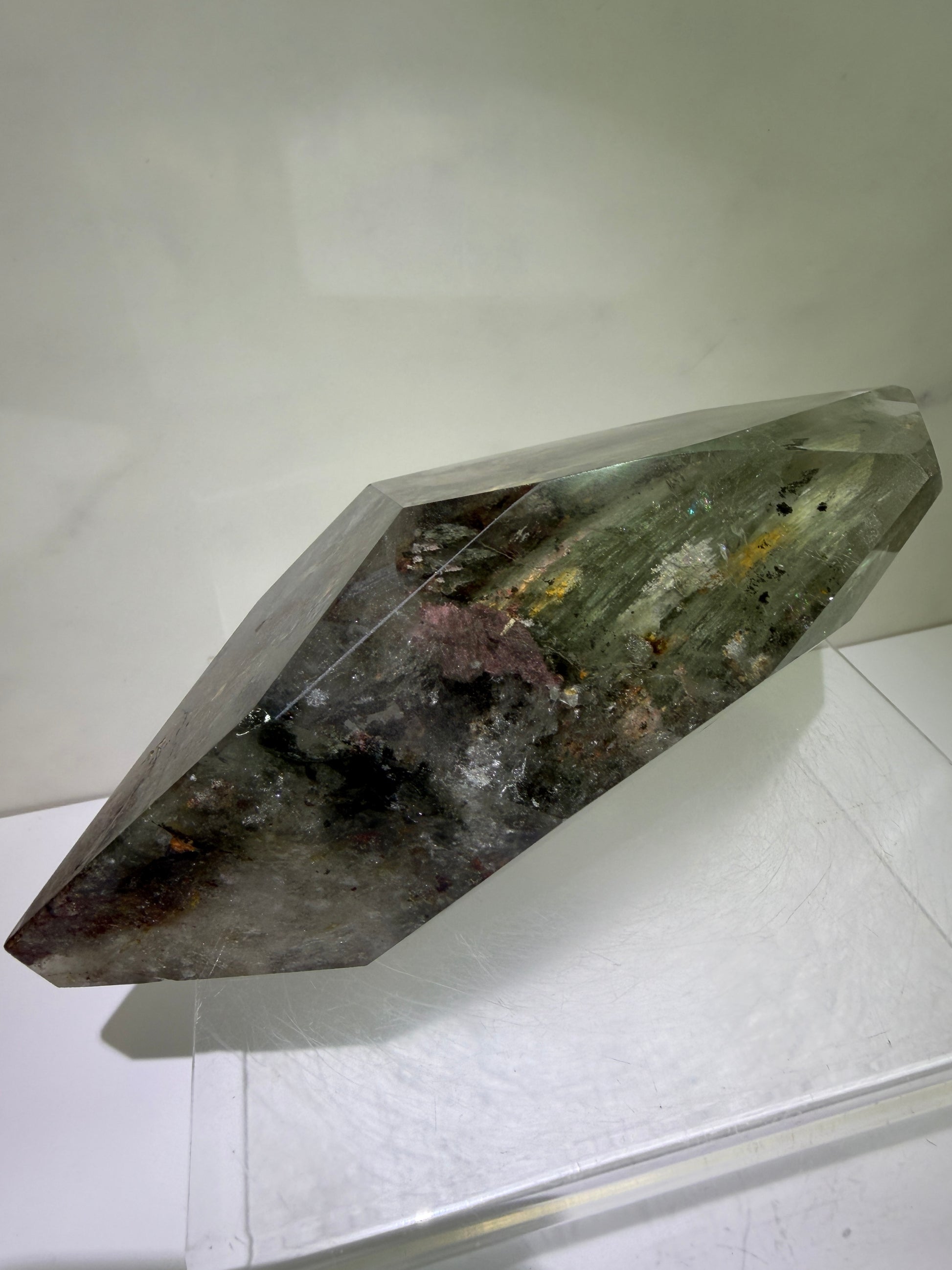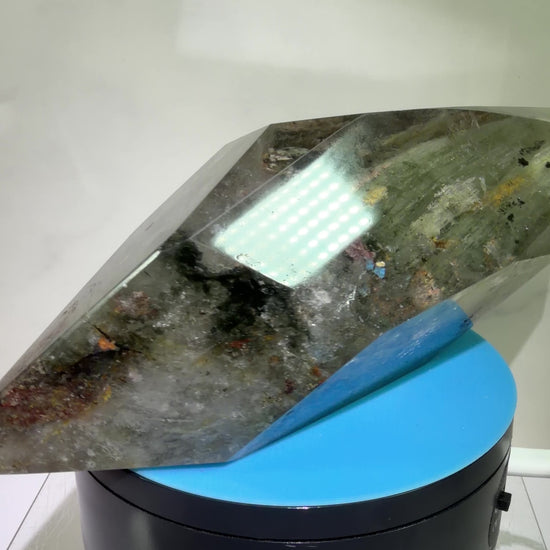 Immerse yourself in the natural beauty of this extra large Garden Quartz freeform crystal. Highly polished for a clear and vibrant appearance, this crystal is of the highest quality. With stunning lodolite patterns, it captures the four seasons landscape in its full and colorful form. A must-have for any crystal enthusiast.
