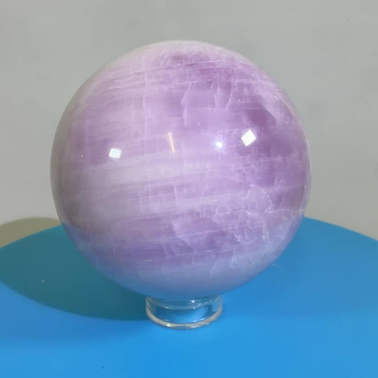 Experience the beauty and rarity of this Kunzite Crystal Sphere. Its stunning lavender hues and excellent flash make it a unique display piece. This rare sphere is a must-have for any crystal collection.