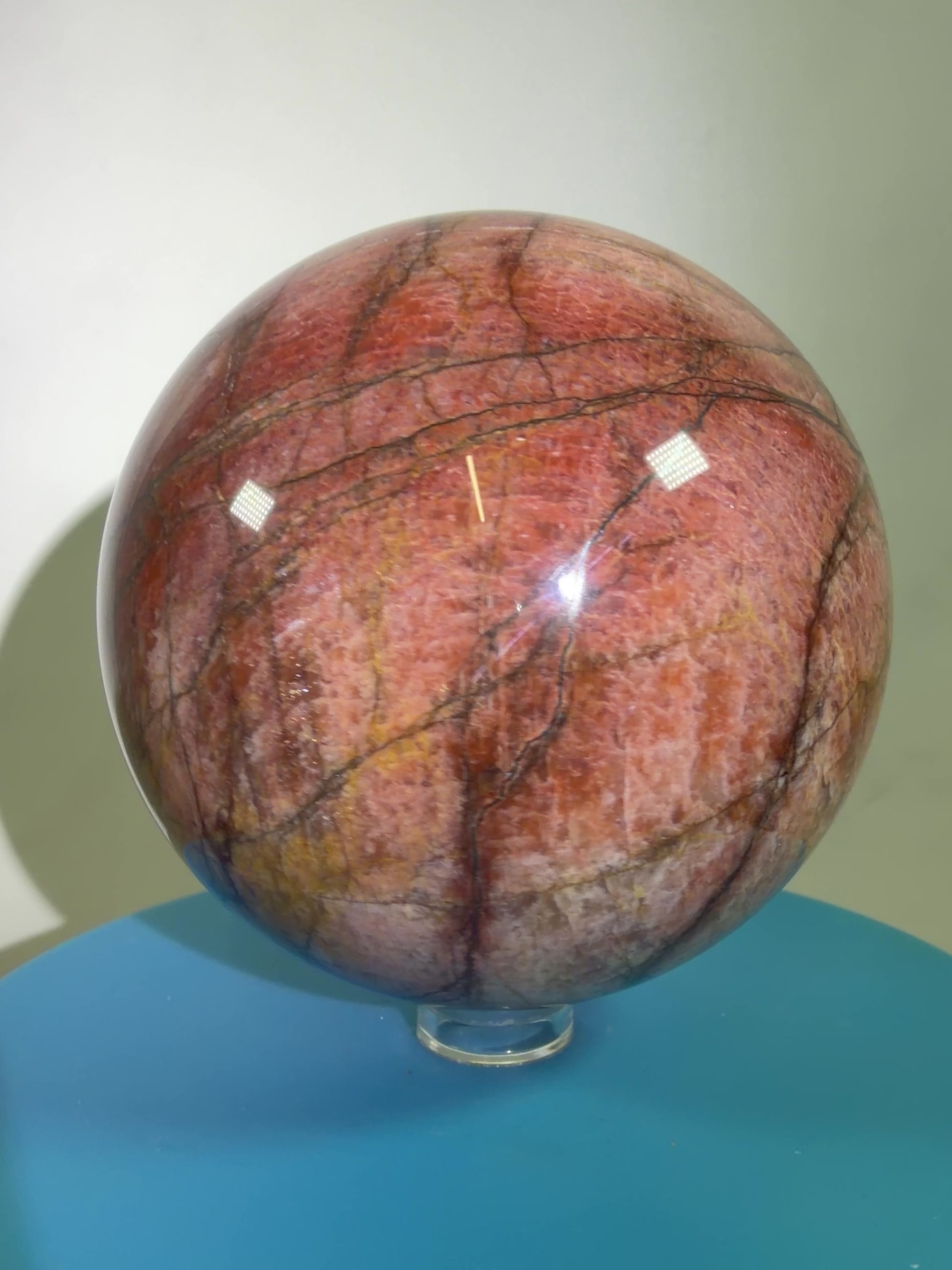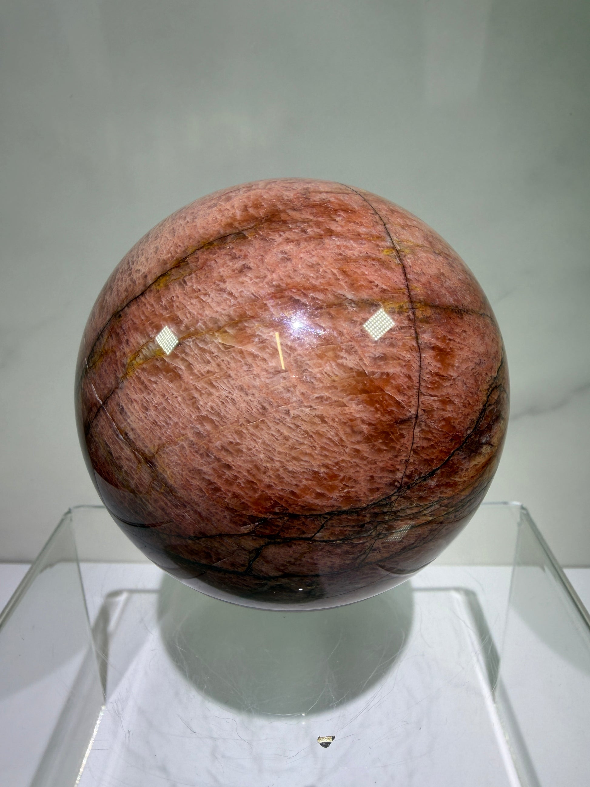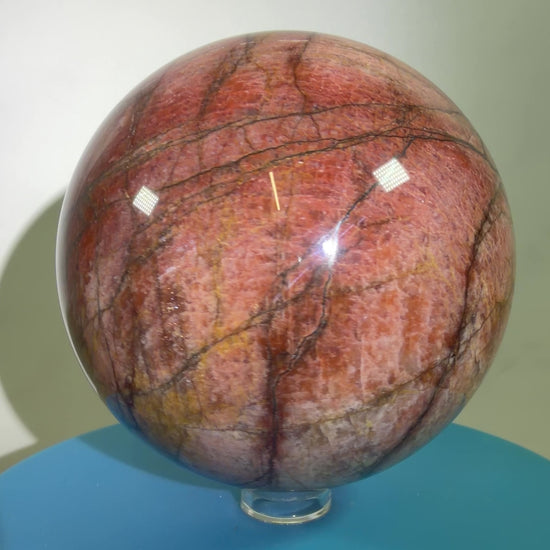 This Pink Amazonite Crystal Sphere from Mozambique is a rare find with stunning colors and high quality. Its unique blend of pinks, reds, and yellows create a vibrant display, while its flashy nature captures attention. Perfect for any crystal collector or display.