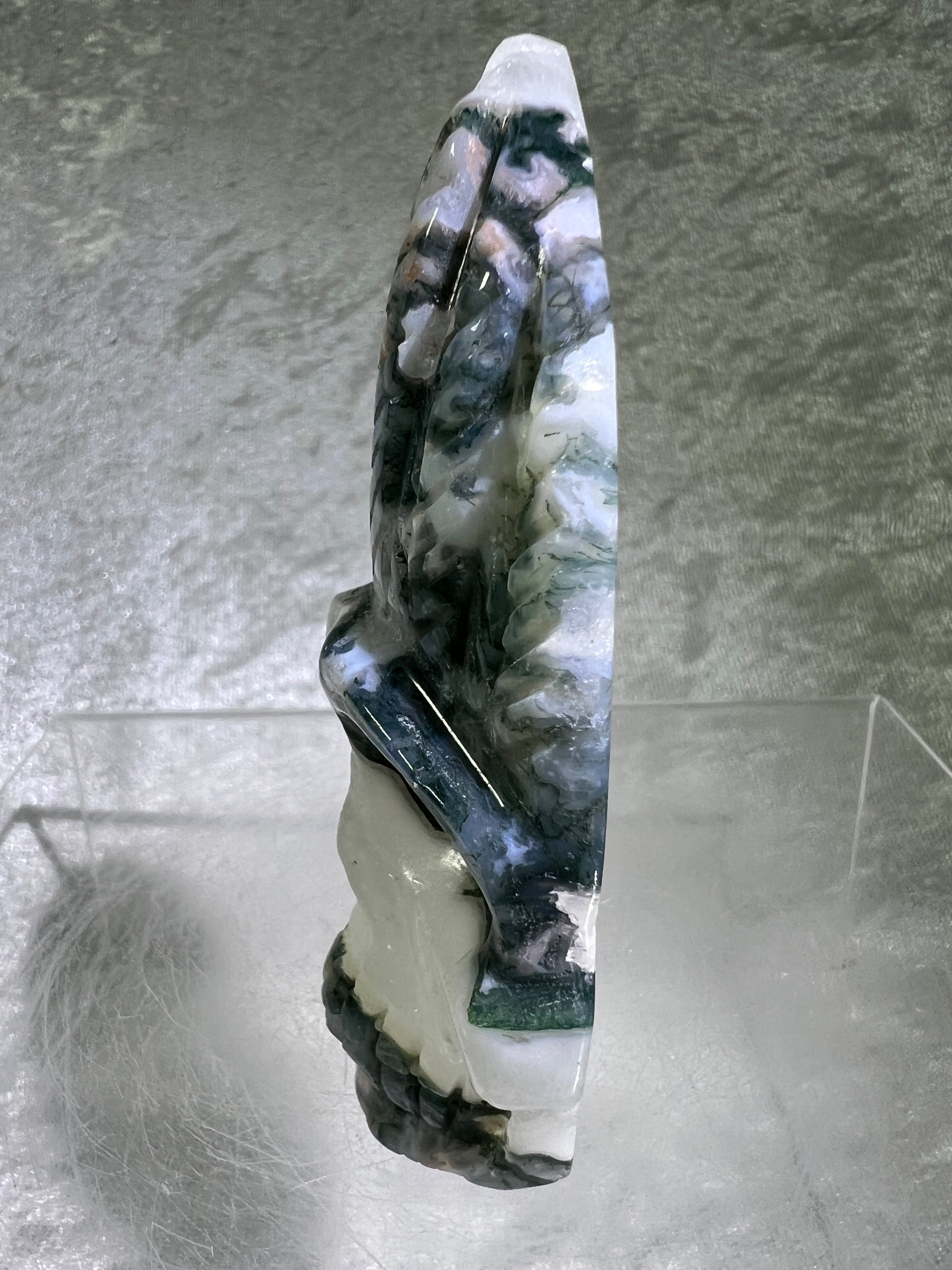 Add a unique touch to your crystal collection with our Moss Agate Crystal Skull Carving! This very cool Indian skull carving is sure to be a conversation starter. Bring a touch of quirkiness to your display with this one-of-a-kind crystal carving.