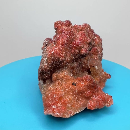 This Red Diamond Calcite specimen from the Potosi mine in Santa Eulalia, Chihuahua Mexico is a stunning addition to any crystal collection. Its flashy appearance and beautiful cluster on matrix make it a very cool display piece.