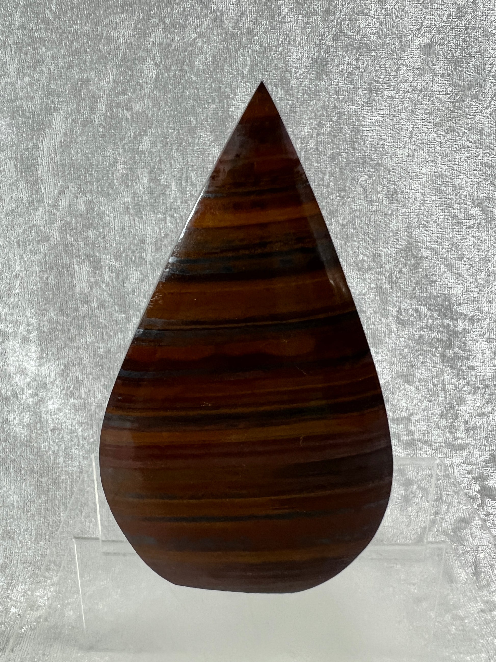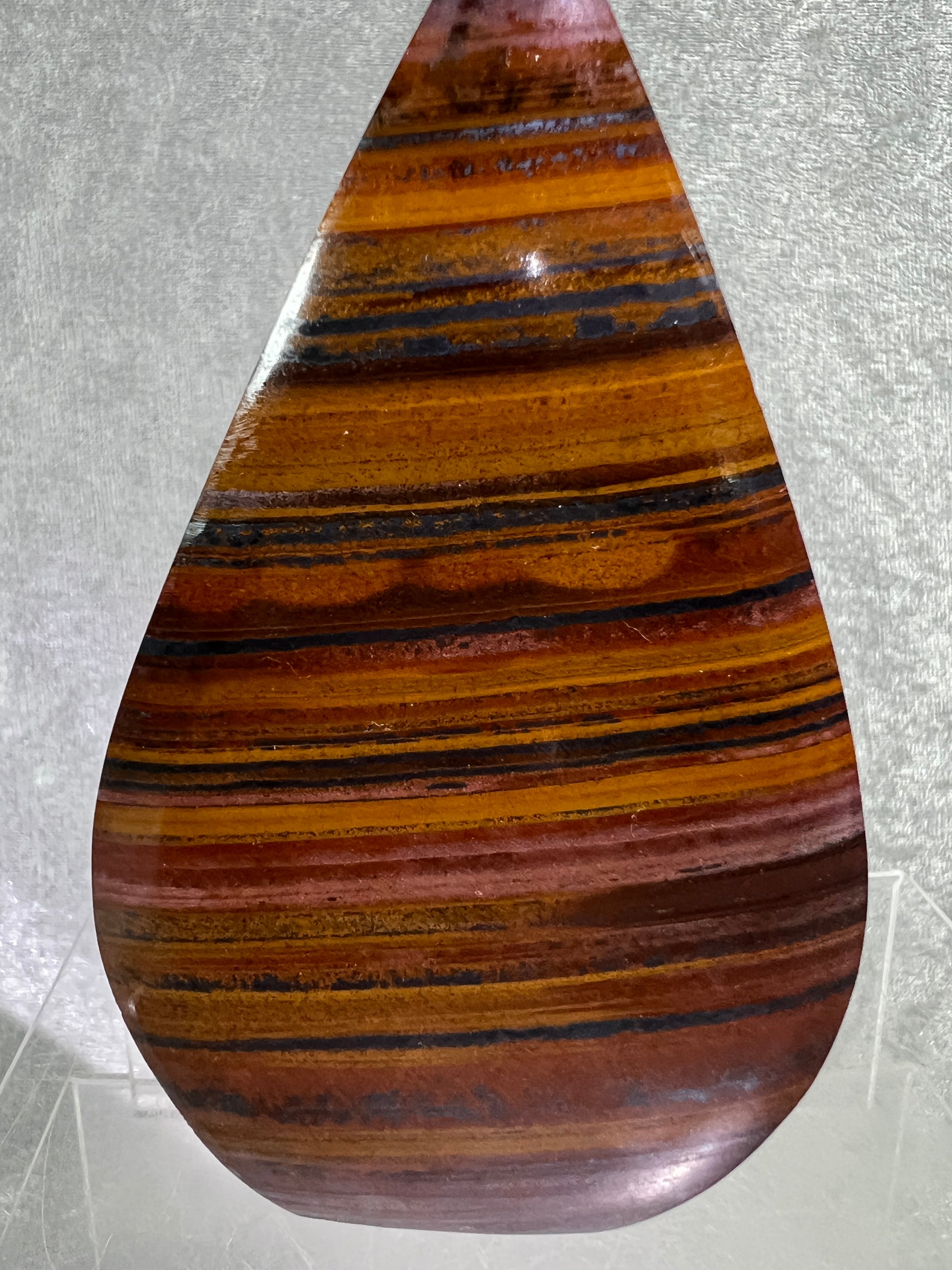 This Tiger Iron Crystal flame is a rare display crystal. Combining tigers eye, red jasper, and hematite, this unique flame offers amazing flashes of color and a one-of-a-kind addition to your crystal collection. Don't miss out on this uncommon and visually stunning piece.