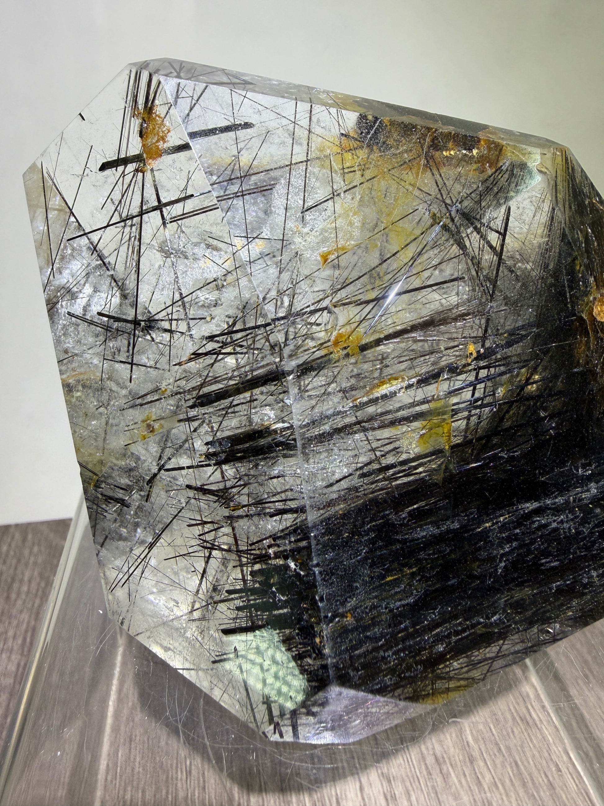 Experience the powerful energy of our Tourmalinated Quartz Polished Freeform. Lots of black tourmaline and small natural druzy spots. This high-quality freeform is infused with the amazing properties of both Black Tourmaline and Golden Healer crystals, creating a unique and beneficial combination.