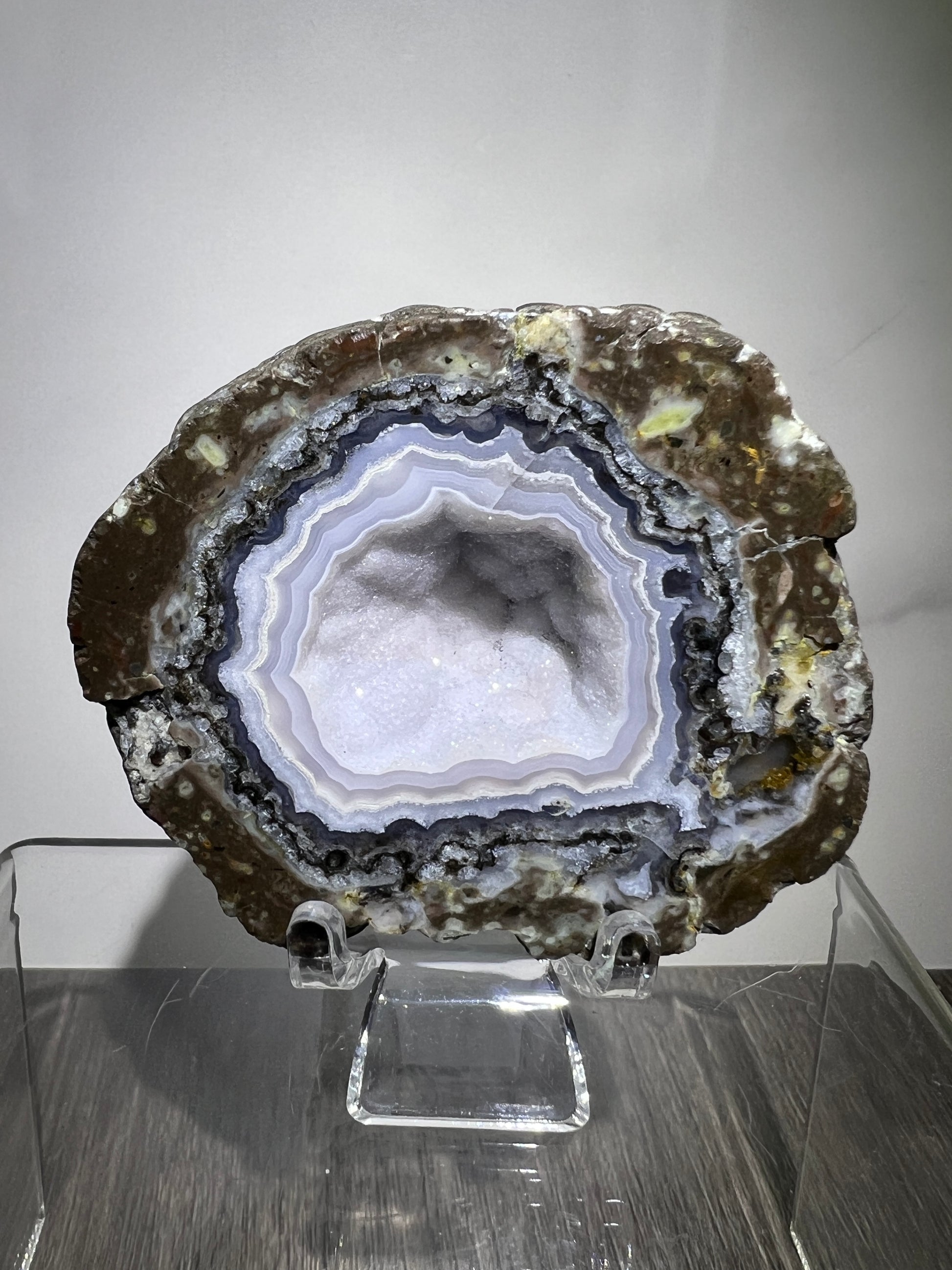 Trancas Geode Specimen From Mexico. A Beautiful Half Geode With Stunning Sugar Druzy. Gorgeous Shortwave UV Reaction!