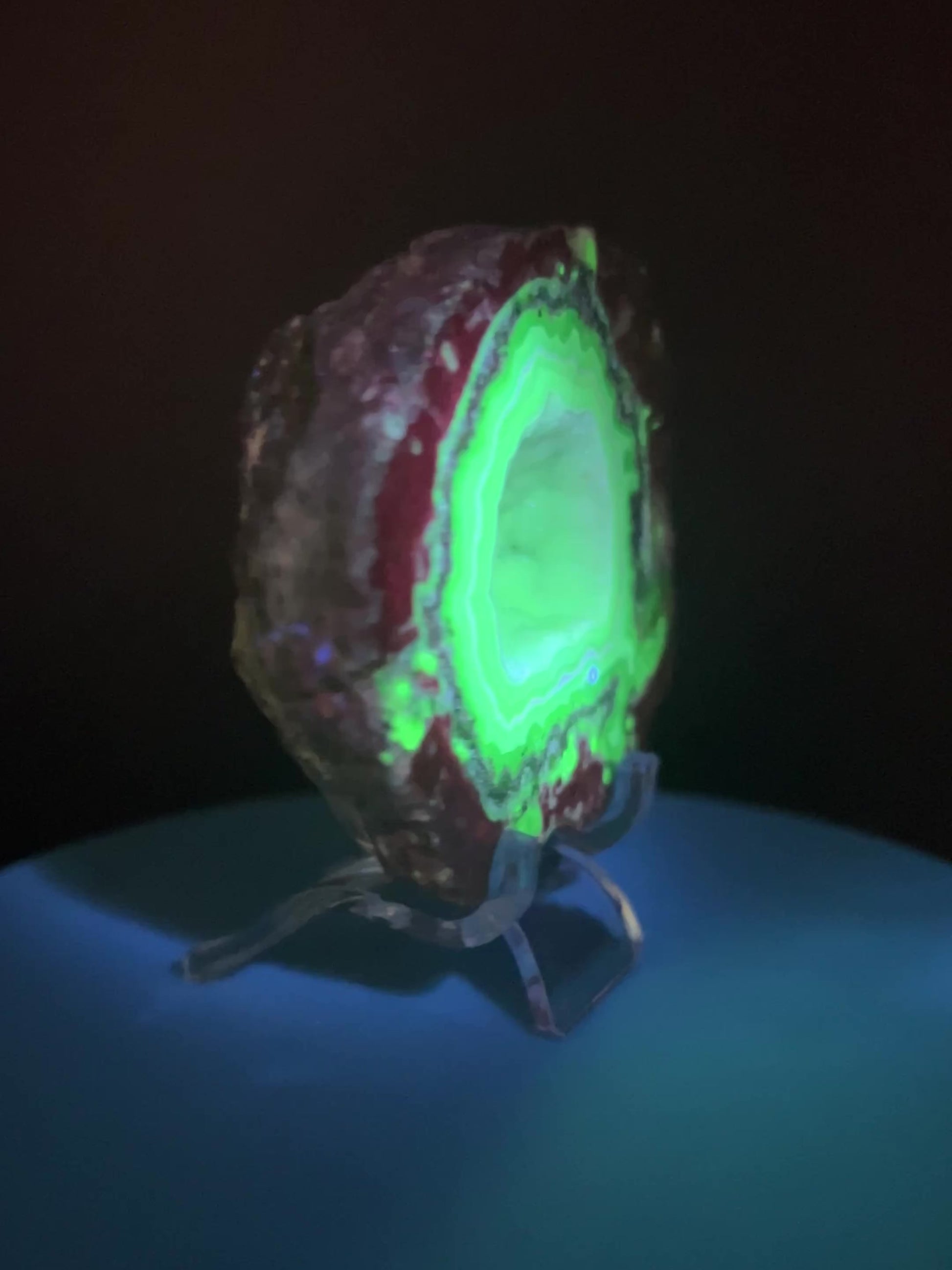 This Trancas crystal geode half from Chihuahua, Mexico is a true treasure. Found inside rhyolite boulders, this geode boasts a beautiful druzy interior that lights up under shortwave UV light. It will only react to a shortwave 255nm UV light. And with excellent UV reaction, it's a must-have for any crystal collector or lover of unique geological formations. Small clear display stand is included.