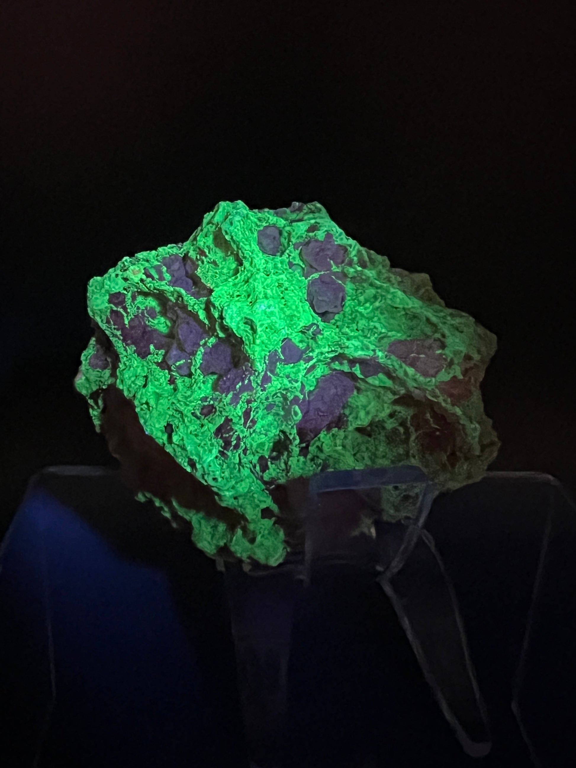 This rare Watermelon Calcite specimen from La Patagonia, Argentina promises to be a stunning addition to any collection. Featuring a high quality intense UV reaction, this gorgeous crystal will be sure to impress. A new discovery that is not to be missed by any collector. With a longwave UV light you will only get an orange reaction on the calcite. For the full watermelon colors you will need a shortwave 255nm UV light.