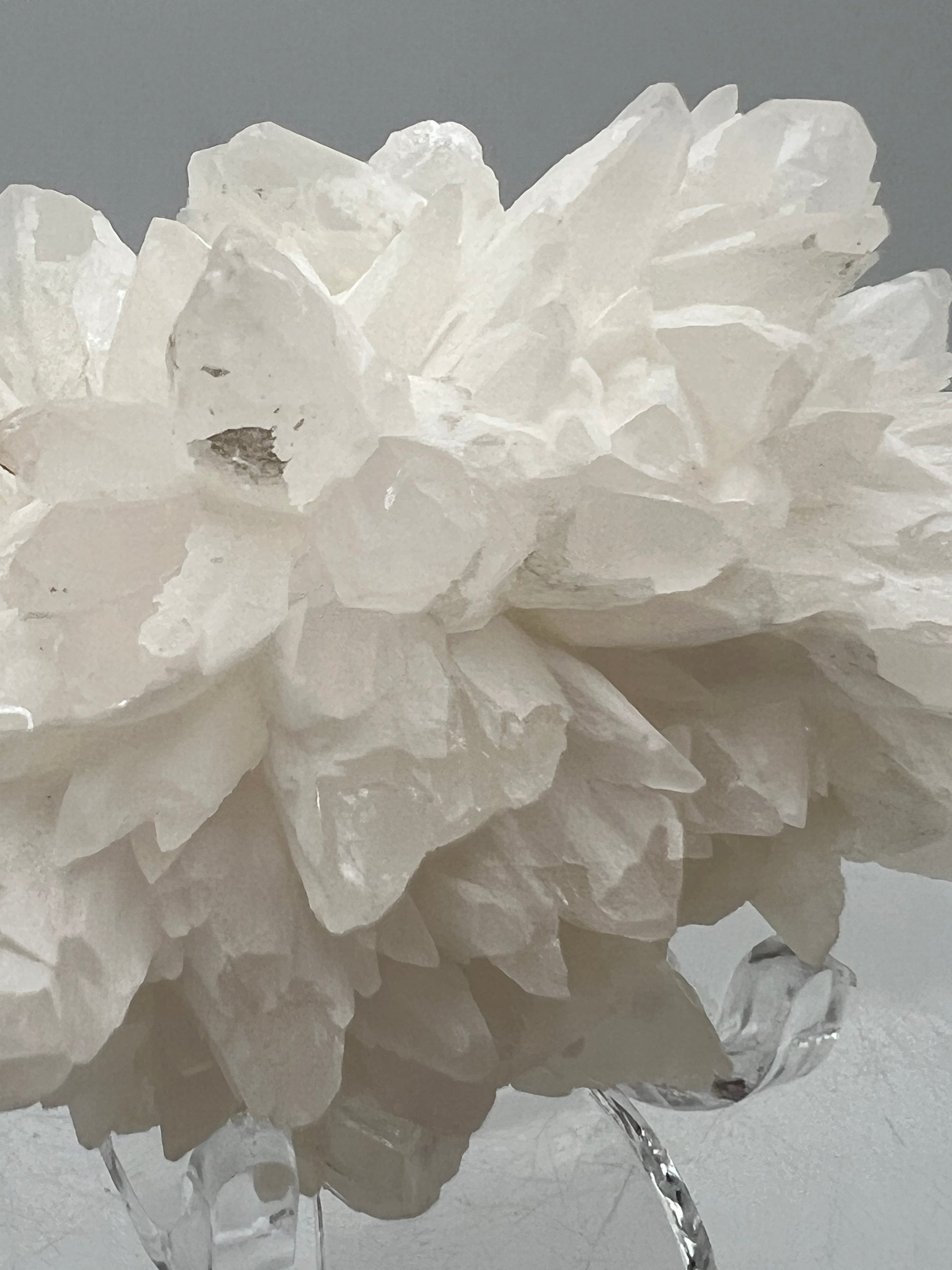 This stunning specimen features dogtooth mangano calcite and marcasite crystals from Guerrero, Mexico. Under a UV light, the bright orange reaction is truly amazing. This specimen is a must-have for any crystal collector, adding a unique and eye-catching display piece to your collection. Small clear display stand is included.