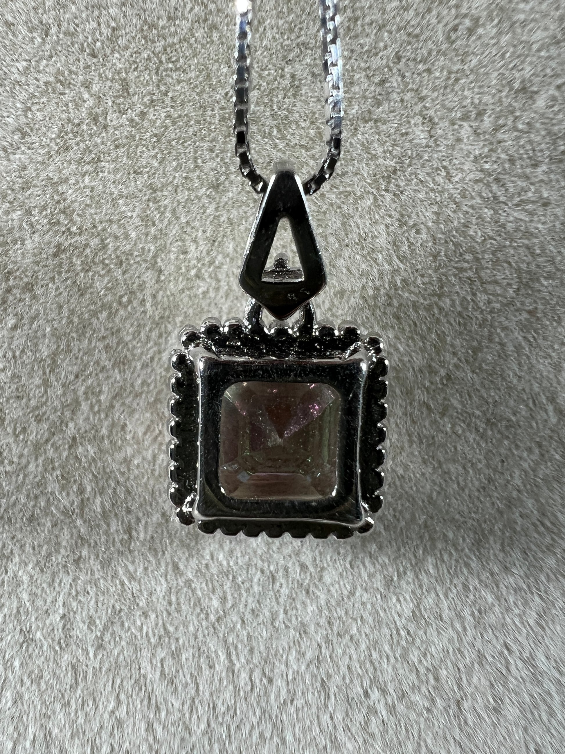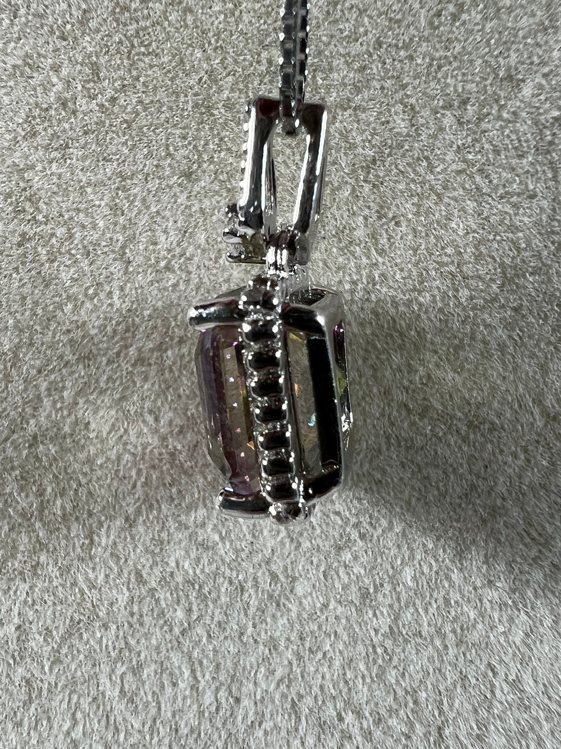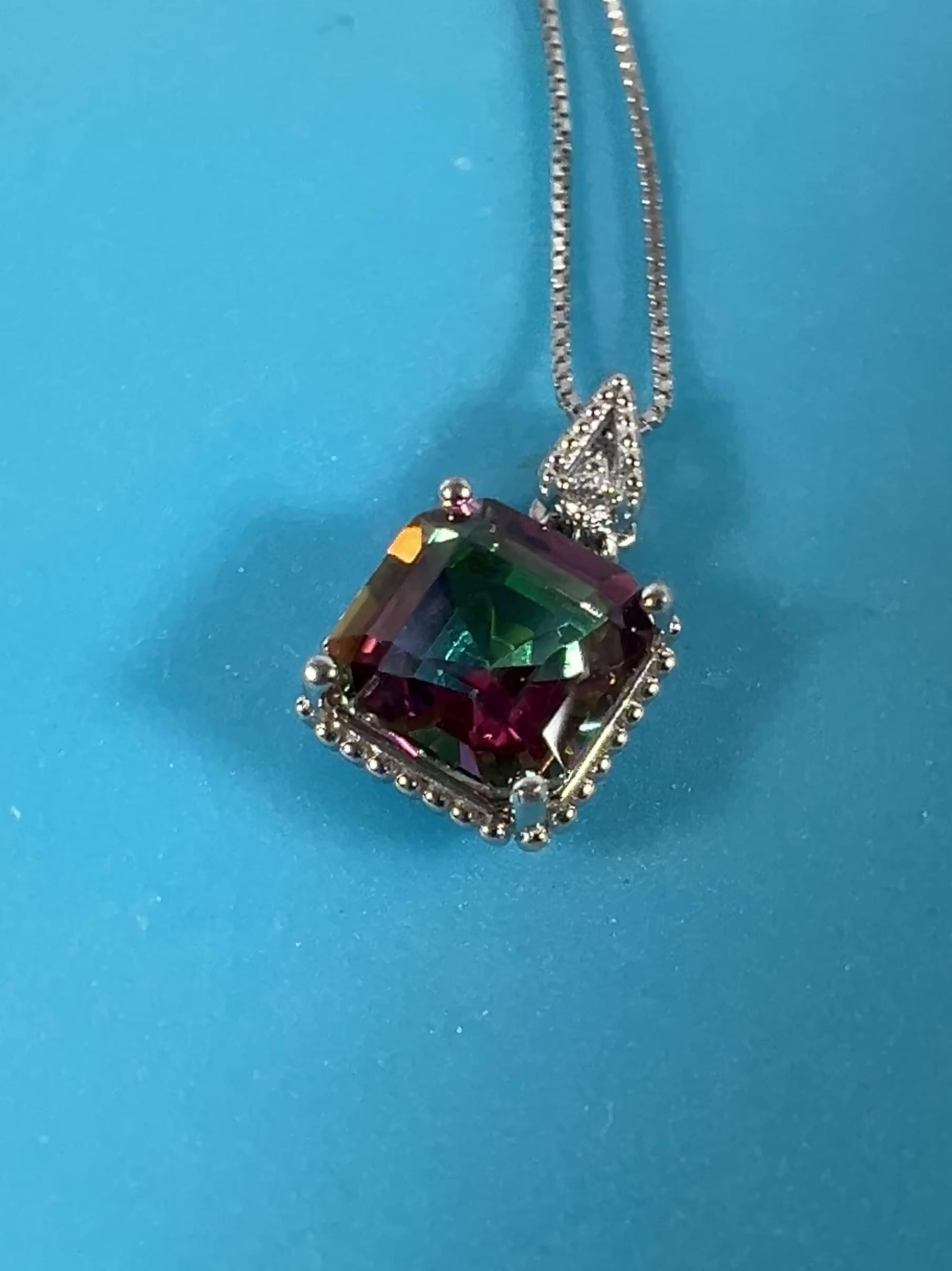 This is a stunning gemstone that is created by treating natural topaz with a special coating to give it a rainbow-like iridescence. Through a modern technology technique called CVD (chemical vapors disposition) the stone is made more desirable. The process places a thin layer of titanium onto a colorless topaz gemstone, resulting an eye-catching variety of colors. Amazing rainbow colors. Includes an 18 inch S925 silver box style necklace.