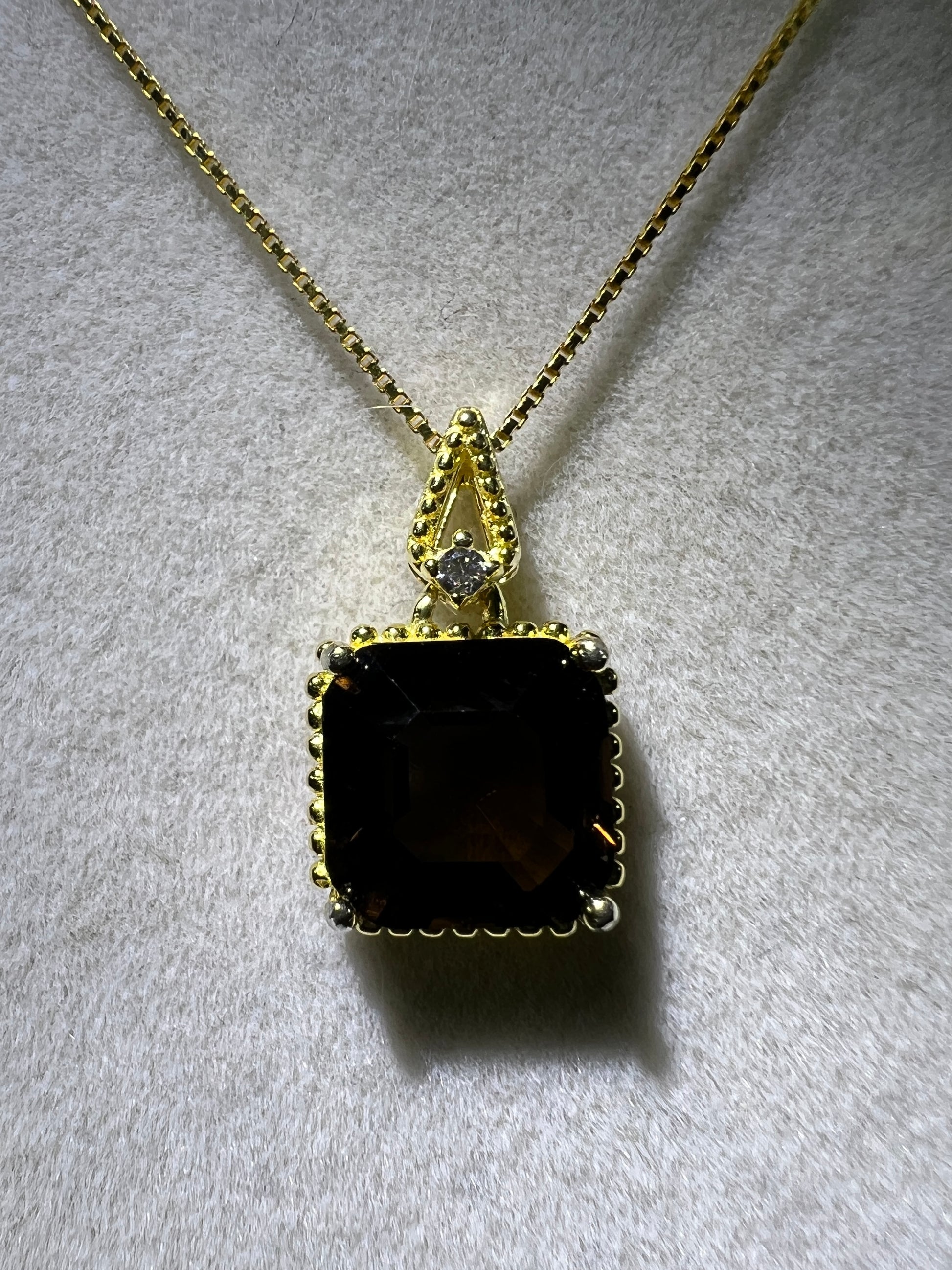 Only the highest quality Smoky Quartz is faceted as a gemstone, and used in jewelry due to its dark and smoky appearance. Natural Smoky Quartz is a type of quartz that is brown, gray, or black in color. It is translucent to opaque, and its color comes from natural radiation. Recently Smoky Quartz has become a very popular gemstone for jewelry makers, due to its amazing beauty. Includes an 18 inch S925 box style necklace.