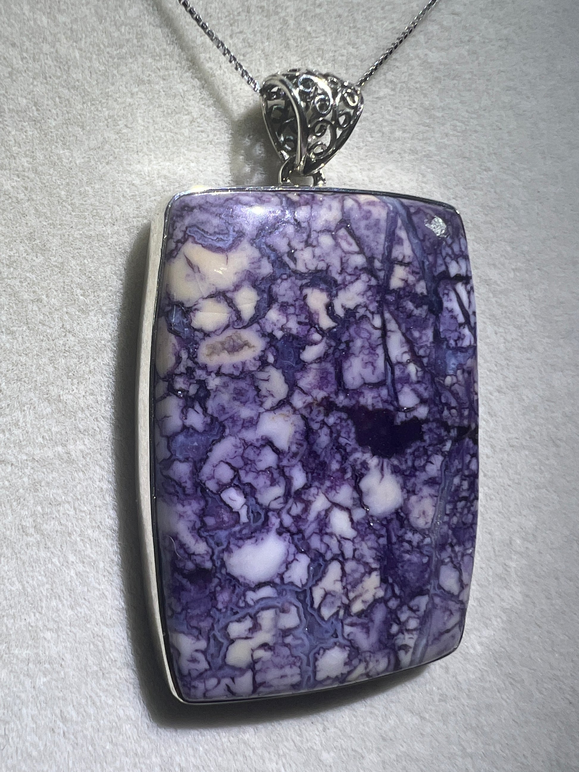 This stunning Tiffany Stone pendant is a rare crystal from Spor Mountain in Utah. The S925 silver setting and necklace add a touch of elegance to this opalized fluorite stone. Elevate your jewelry collection with this unique and high-quality piece.