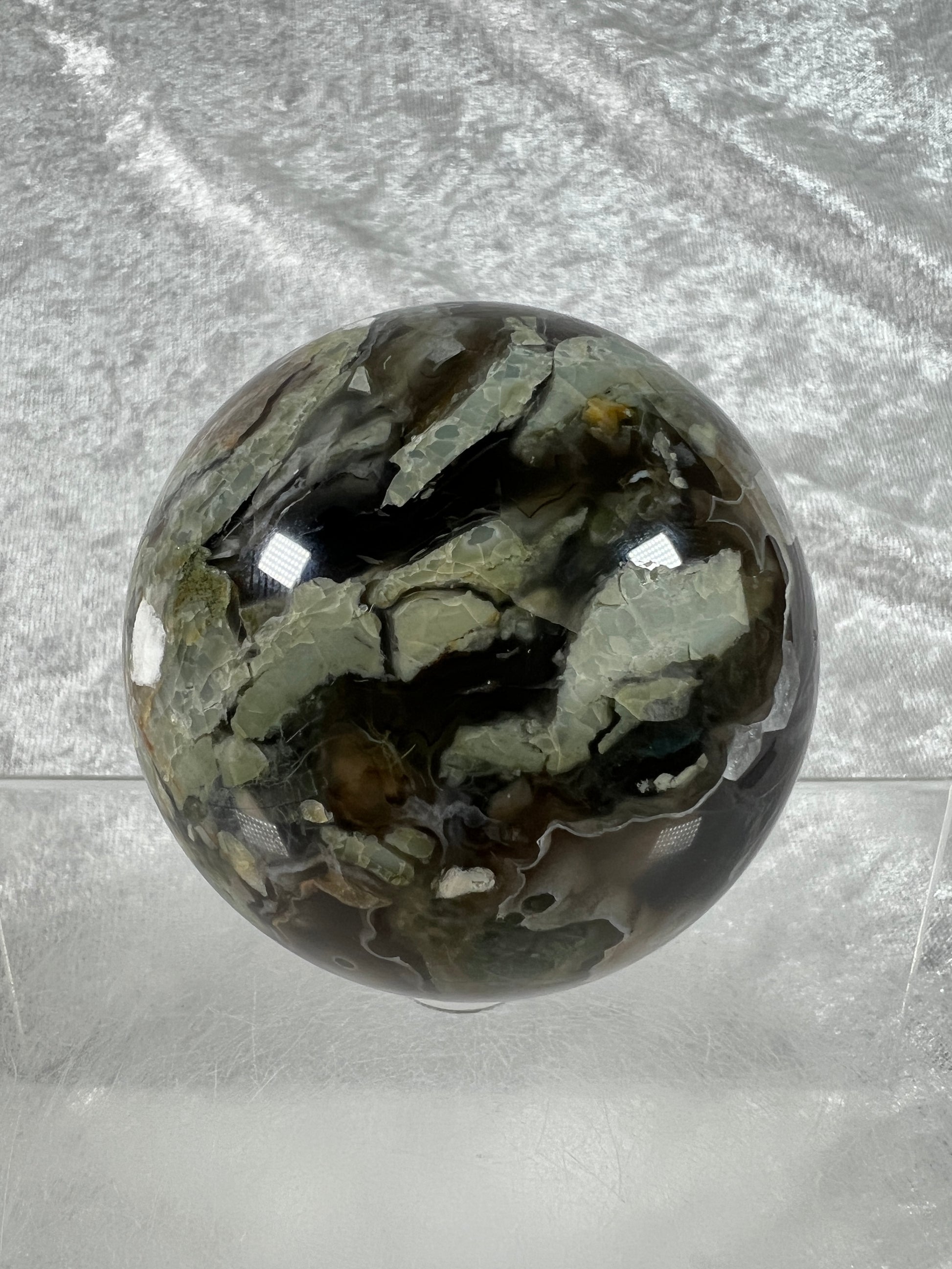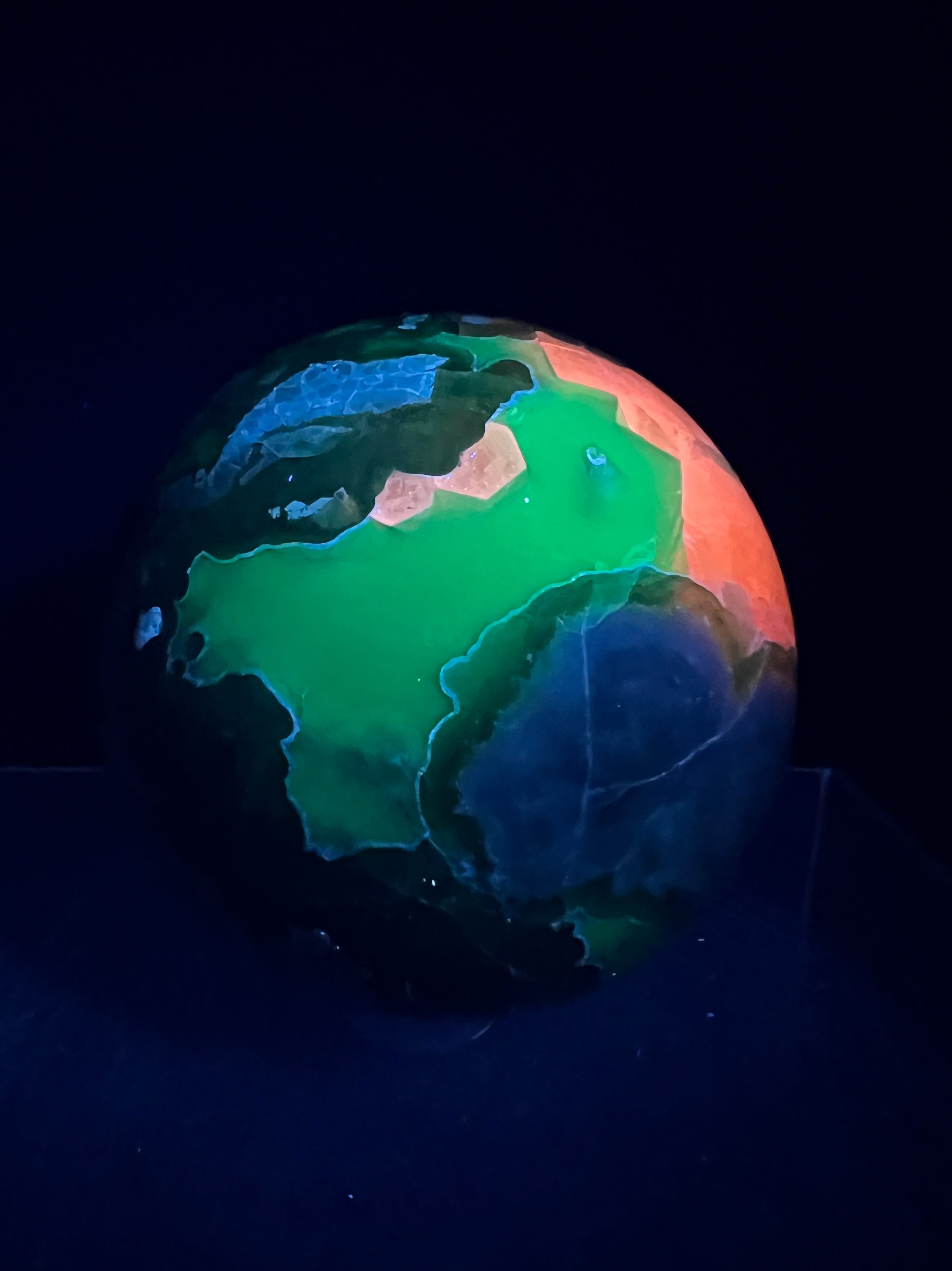 Volcano Agate With Mangano Calcite Sphere. 65mm. Stunning Green And Orange UV Reaction. Amazing High Quality Display Sphere.