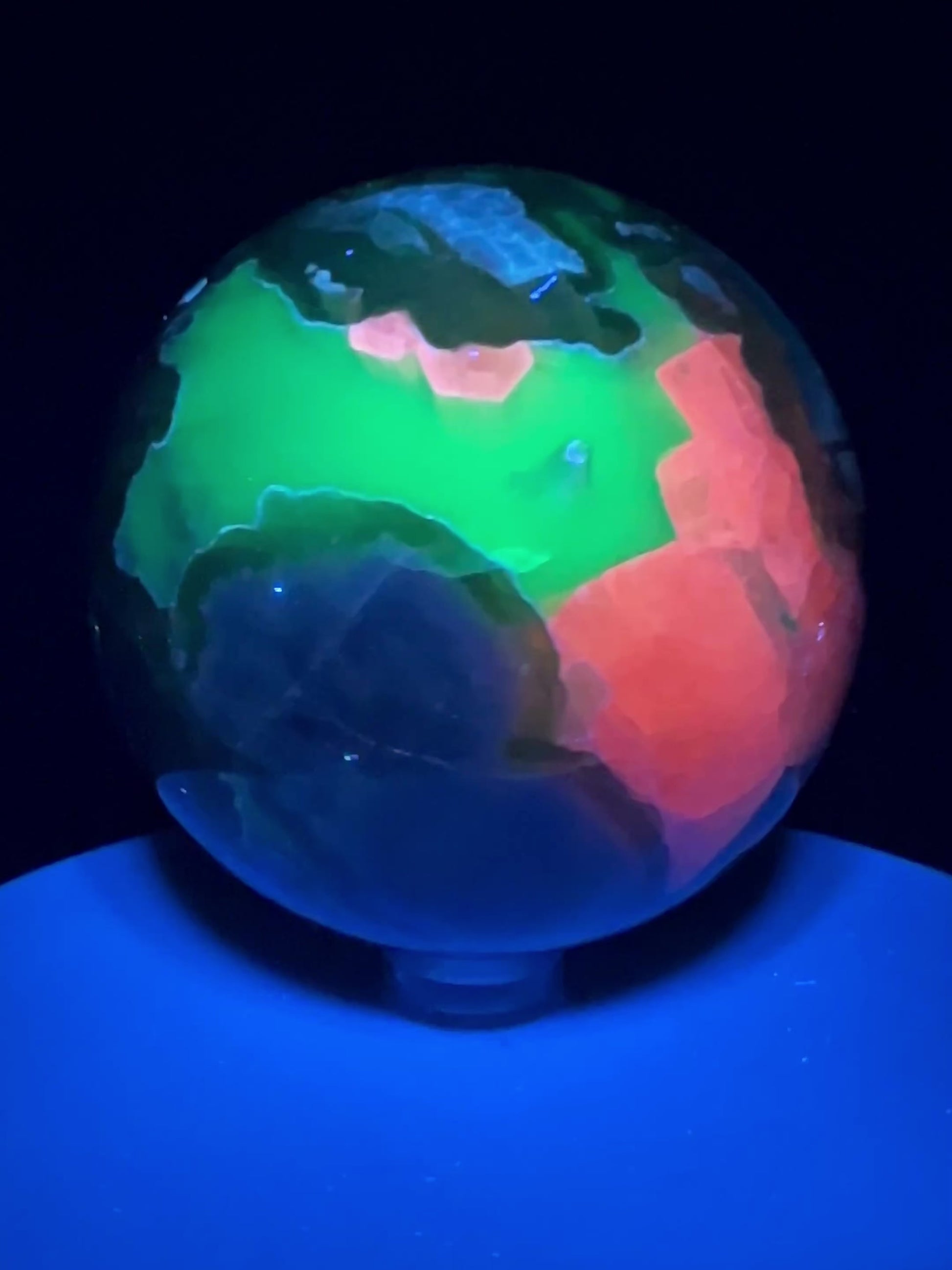 This Volcano Agate with Mangano Calcite Sphere is a rare and stunning piece that displays a beautiful combination of green and orange uv colors. Its high quality and intense UV reaction make it a perfect addition to any collection. Don't miss out on this amazing display sphere.